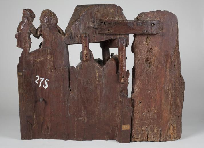 | Keywords: MCC-42318 Geboorte van Christus, aanbidding der herders (2).tif Artwork nl Anonymous Utrecht nl Voor een vervallen stal in het midden van de voorstelling knielt Maria links in aanbidding neer bij het kindje dat in het stro ligt Ook zijn twee engelen bij het kind neergeknield De ene en profil rechts op de voorgrond bespeelt een harp die hij voor zich houdt De andere zit schuin achter het kindje rechts van Maria en heeft zijn handen gevouwen voor zich Achter de harpspelende engel staat Jozef driekwart naar links gewend Hij kijkt wat voorovergebogen op het kind neer In zijn verdwenen linkerhand droeg hij waarschijnlijk een kaars waarvan hij het licht met zijn geheven rechter hand afschermde tegen de stralen die van het kind uitgaan Op de achtergrond rechts boven op een rots of heuvel staat een derde engel die met zijn rechterhand het kind aanwijst aan een klein afgebeelde herder die rechts naast hem loopt In de stal achter een met leem bestreken tenen wand kijkt nog een herder toe waarvan alleen het hoofd en de schouders zichtbaar zijn Het dak van de stal rust op vier pilaren In de voorzijde ervan is een rechthoekig venster aangebracht waarin twee duifjes zitten Tussen de twee linkerpilaren door hebben de os en de ezel hun koppen naar buiten gestoken Terwijl de os naar voren kijkt neemt de ezel een flinke hap stro uit de kribbe die voor hem staat Het linker gedeelte van de voorstelling wordt ingenomen door een grote rotsige heuvelpartij waarvoor een herder staat Hij heeft zijn bovenlichaam bijna en profil naar rechts gedraaid en zijn linkerbeen iets naar voren geplaatst en kijkt naar het geboortetafereel Hij leunt met beide handen op een herdersstaf die aan de onderzijde voorzien is van een schep De heuvelige bodem is afgewerkt met zigzaggroeven Maria draagt een lang gewaad Haar mantel is van haar rechterschouder gegleden tot op haar heupen en bedekt in soepele plooien de grond Haar kleed heeft omgeslagen mouwboorden Over haar hoofd een deels teruggeslagen sluier De engelen zijn gekleed in gegorde albes De achterste engel heeft een diadeem op het hoofd Aan de gordel rond Jozefs kleed hangt een rozenkrans Zijn mantel is teruggeslagen over zijn linker schouder Op zijn hoofd een kaproenachtig hoofddeksel en om zijn hals een grote sjaal De herder rechts op de achtergrond heeft een hoed met opgeslagen achterrand op het hoofd Hij draagt een korte gegorde tuniek met v-hals Aan zijn riem hangen een tas en een hoornachtig voorwerp Hij heeft puntig schoeisel en zijn kousen lijken afgerold Van de herder achter de wand is alleen te zien dat hij een kap draagt De linker herder is gekleed in een korte gegorde tuniek met kort ingesneden wambuis en lage schoenen met afgeronde neus Op zijn hoofd een hoed waar aan de linkerkant een doek onderuit hangt Zijn handen zijn in wanten gestoken Polychromie Het stuk is deels bedekt met oude maar niet oorspronkelijke polychromie De bruine retouches van de witte grond en de lacunes maken het moeilijk nog onderliggende lagen te onderscheiden Het stuk lijkt grondig schoongemaakt voordat het opnieuw is gestoffeerd Incarnaat lichtroze met rode blossen De herders vertonen een oranje-achtig incarnaat De ogen zijn gedetailleerd in zwart en bruin; monden helderrood Maria's haar is bruin haar sluier en binnenkant van de mantel blauw; buitenzijden mantel deels rood deels blauw verkeerd geïnterpreteerd door de stoffeerder ; gewaad rood met vergulde boorden De matte vergulding lijkt op een gelige grond te liggen De albes van de engelen zijn roze Hun haar matverguld op een gelige grond De harp is verguld De boorden van de albes zijn verguld Jozef haar bruin rand van de hoed verguld op gelige grond; slip rood; sjaal wit; kleed en rozenkrans rood; mantel bruin Kleine herder hoed rood; haar donkerbruin waaronder resten van oranjerood bolus ; kleed blauw; hoorn gordel en tas gelig; kousen en schoenen donkerrood Kap herder blauw met een witte rand Os rood tanden wit hoorns roze Ezel lichtbruin Stro geel Ruif lichtbruin waarop donkerbruin Herder links hoed blauw met rode slip; wambuis bruin met rode kraag manchetten en split; tuniek blauw waarop sporen vergulding; buidel lichtgeel; kousen wit; schoenen donkerbruin Onder het wit van de kousen mogelijk roze incarnaat Staf lichtbruin met blauwe schep Stal zuilen en achterwand rechts donkerbruin; strodak geelbruin; gevel donkerbruin met witte duifjes waarvan er een een rode snavel heeft; wand blauw; vleugels middelste geknielde engel wit met vergulde rand Heuvels resten geel bruin en groen Het geel ligt deels over het groen Rotsen links bovenaan heel lichtroze waaronder vergulding op rood-achtige bolus Techniek De groep is uit meerdere delen samengesteld Het rechtergedeelte met de stal Maria Jozef en de engelen vormt één geheel uitgezonderd de rechts op de voorgrond knielende engel en het kindje op het stro De kern lag achter het werkblok Aan dit gedeelte zijn toegevoegd het rechterduifje in de stal genoemd kindje en engel en de grond onder de engel De figuren op de voorgrond zijn rondom bewerkt Het linkergedeelte met de rotsen en de grote herderfiguur vormt één geheel De herder is bijna rondom uitgewerkt De twee delen zijn aan elkaar gezet door middel van houten pennen en verbindingsplankjes die met grote nagels in de onderzijde van de delen zijn bevestigd Ook bovenaan de achterzijde bevindt zich een origineel verbindingsplankje vastgezet met zes gesmede nagels twee verdwenen Mogelijk liep dit plankje verder door naar links waar nog twee gesmede nagels aanwezig zijn Een deel van de grond tussen beide delen vormt eveneens een verbinding en is met twee houten pennen en een ijzeren nagel in de voorzijde vastgezet De grond onder de engel is met houten pennen en een metalen nagel bevestigd Het kind is op de grond gelijmd en ingepend De harp bestaat uit twee delen De linkerhand van de linkerengel vormt één geheel met de snaren De delen lijken gelijmd en daarna met een grote nagel onderaan in de engel vastgezet Het rechter duifj