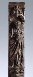 | Keywords: MCC-42808 Deurnaald met Johannes de Doper en Catharina van Alexandrië, elk op een console onder een baldakijn (2).tif Artwork nl Anonymous Utrecht nl De deurnaald is aan de voorzijde gedecoreerd met de heiligen Johannes de Doper en Catharina onder laatgotische baldakijnen boven een hoge met pinakels gedecoreerde onderzone Johannes de Doper is aan het bovenuiteinde aangebracht Hij is frontaal weergegeven rustend op zijn rechterbeen Hij heeft zijn gezicht driekwart naar rechts gewend en wijst met zijn rechterhand op zijn attribuut het lam Het lam ligt naar links gewend op een boek dat de heilige in zijn linkerhand houdt Johannes is gehuld in een mantel die over beide schouders ligt De mantel is onder zijn rechterarm door getrokken en over zijn linkerschouder gevoerd Het andere uiteinde hangt af van zijn linkerarm Hij draagt een kleed waarin een opstaande kraag van een onderkleed zichtbaar is Tussen zijn benen hangt een slip van het gewaad naar beneden en over de grond Hij is blootsvoets Zijn gezicht is omgeven door wijd uitstaande haren zijn baard is gespleten Boven zijn hoofd een ajour bewerkt baldakijn met in- en uitzwenkende geprofileerde randen en kleine hogels In het midden een vooruitspringende pinakel Ook aan weerszijden pinakels De bovenzijde van het baldakijn waarachter een kwartholprofiel begint lijkt ingekort Hij staat op een overhoeks gestelde sokkel die een met bladeren versierd kapiteel met profielranden heeft De zijden van de sokkel vertonen roodboognissen De sokkel rust op het baldakijn van het Catharinabeeldje dat ongeveer in het midden van de deurnaald is aangebracht Catharina is frontaal weergegeven met iets vooruitgeschoven linkervoet Aan haar voeten links verschijnt het bovenlichaam van keizer Maxentius Haar verkeerd geplaatste rechterhand is tegen haar gewaad gedrukt in de gebalde linkerhand zal zij haar attribuut het zwaard hebben geklemd Catharina draagt een diadeem op haar lange golvende haar Haar mantel ligt over haar schouders en is op de borst met een dubbel koord gesloten Haar bovenkleed heeft een ronde hals waarin een hemd met v-hals zichtbaar is De nauwsluitende keurs is voorzien van een verticale reeks vierkante versieringen De wijde rok heeft zij onder beide armen opgenomen en over haar linkerarm extra hoog opgetrokken Links van het midden is hierdoor een reeks onregelmatige plooien ontstaan rechts een bundel pijpplooien Onder de rok is het wijde onderkleed zichtbaar en haar in een trip gestoken linkerschoen met stompe neus De keizer heeft zich driekwart naar links gedraaid Hij steunt met zijn rechter onderarm op de sokkel In zijn rechterhand hield hij waarschijnlijk een nu verdwenen scepter Hij is driekwart naar links weergegeven het gezicht frontaal Hij heeft een tulband op het hoofd en draagt een bovenkleed met bloezende mouwen en schouderkraag of mantel Zijn brede baard is gespleten Boven Catharina hangt een ajour bewerkt baldakijn dat aan de voorzijde wordt afgesloten door een ronde driepasboog aan de zijkanten door spitse driepasbogen Op de hoeken pinakels op hangende kraagstenen waartussen golvende tracering met hogels die aan de bovenzijde tegen de overhoeks geplaatste sokkel van Johannes rust De figuren rusten op een veelkantige sokkel met bladversiering tussen geprofileerde lijsten Deze sokkel lijkt te rusten op twee overhoeks gestelde spitsbogen met hogels en kruisbloemen die in het midden rusten op een colonnet met halsring en bladkapiteel Bijna onderaan de colonet oorspronkelijk waarschijnlijk ongeveer in het midden een tweede ring Onder beide bogen een lange pinakel Techniek In het midden van de deurnaald bevindt zich aan de achterzijde een halfronde uitholling Waarschijnlijk is dit het restant van een boorgat waarin een wig werd gedreven om het werkblok te splijten Op de plaats waar dit restant van het boorgat zichtbaar was namelijk in de strook die over de naad tussen de deuren sloot is het boorgat gedicht met een rechthoekig blokje hout De deurnaald is op een rechterdeur gepend geweest de achterzijde van het rechtergedeelte is minder verkleurd dan het linker en vertoont vier pengaten doorsn ca 1 cm Staat De deurnaald is oorspronkelijk langer geweest Hij is aan de bovenzijde en onderzijde ingekort De halsringen van de onderzone hebben mogelijk ter halver hoogte van de colonetten gezeten die zelf weer op een geprofileerde plint gestaan zullen hebben De oorspronkelijke hoogte zal ca 2 m zijn geweest De bovenafsluiting is waarschijnlijk ook langer geweest De versiering boven het baldakijn van Johannes zal hoger zijn geweest afgezaagd De onderkant is vrij lang geleden afgezaagd en daarna nog weer aan vocht blootgesteld geweest In de achterzijde een later aangebrachte verticale groef waarin resten van naaldhout en lijmsporen hergebruik Een deel van de gewaadslip van Johannes is bijgezaagd met de voorzijde van de sokkel Idem een deel van het gewaad op zijn linkerknie De rechterhand van Johannes is niet origineel of bijgewerkt De mantelsip en het uiteinde van de mouw zijn bijgesneden Het proportioneel gezien veel te kleine en te hoog geplaatste handje is ingestoken De mantelplooi recht onder het lam is afgebroken en bijgesneden Het rechterhandje van Catharina lijkt niet origineel Het is grover dan het linker en de positie is verkeerd het lijkt alsof een slip van de keding wordt gesteund Oorspronkelijk zal Catharina echter een boek op de rechterhand hebben gedragen Het hoofd van Catharina lijkt bijgezaagd en vertoont een cirkelvormige groef nu gestopt met was waarin t t v de aankoop een modern metalen kroontje was geplaatst De onderste twee halsringen van de kolonetten links en midden zijn los ingestoken reparaties De kruisbloem op de linker spitse driepasboog van de onderzone is bijgemaakt en aangezet met twee houten pennen Ontbreken de kroon en het zwaard van Catharina de scepter van de keizer Afgebroken het uiteinde van Catharina's rechtermouw een deel van de mantelplooi rechts; de linkerhand van de keizer spijker in breukvlak ; dele