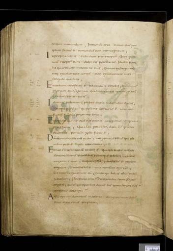 Keywords: MCC-61050 Evangeliarium (Lebuïnuscodex) (226).jpg Artwork nl Anonymous Noordoost-Frankrijk Anonymous Rijnland Anonymous Maasland nl De kern van de boekband van de Lebuïnuscodex wordt gevormd door twee eikenhouten platten De rug en het achterplat zijn overtrokken met zeemleer Het voorplat is rijkelijk versierd met verguld zilversmeedwerk reliëfs van walrustand en verscheidene stenen De compositie van de bekleding van het voorplat wordt bepaald door een verguld zilveren filigraankruis Aan de uiteinden van de kruisarmen bevinden zich vierpassen met overhoeks vierkant eveneens met filigraan gedecoreerd Hiervan zijn er slechts twee bewaard gebleven en wel die aan de verticale kruisarmen Zij bevatten tevens nog de oorspronkelijke versiering bestaande uit een filigraanmedaillon met een pseudo-camee van respectievelijk een mannen- en een vrouwenhoofd in profiel Het snijpunt van het kruis wordt ingenomen door een ver vooruitstekend Bacchuskopje in chalcedoon te herkennen aan de kleine druiventrosjes in zijn haartooi Het kopje is gevat in een filigraanmedaillon welke op zijn beurt weer is geplaatst op een vierpas van filigraanwerk Op elk van de kruisarmen bevindt zich een ovale steen 'en cabochon' op een medaillon met filigraan Het filigraanwerk van kruis en sierstukken is in de vorm van visblazen In de ruimten tussen de kruisarmen zijn rechthoekige reliëfs van walrustand aangebracht met de vier evangelisten en hun symbool De reliëfs hebben de volgende afmetingen H 10 0 x B 5 5 cm Van links boven naar rechts onder betreft het Mattheus met de engel Johannes met de adelaar Marcus met de gevleugelde leeuw en Lucas met de gevleugelde os De figuren zijn paarsgewijs als elkaars spiegelbeeld ten opzichte van de middenas geplaatst Mattheus en Johannes zitten vrijwel geheel frontaal terwijl Marcus en Lucas meer in profiel zijn afgebeeld Qua opbouw verschillen de vier reliëfs nauwelijks van elkaar Binnen een rand van vierlobbige blaadjes verheffen zich twee zuilen met een basis een kapiteel en een dekplaat Hierop rust een rondboog geflankeerd door twee torens en afgedekt met een fronton dat boven Mattheus en Johannes boogvormig en boven Marcus en Lucas driehoekig is Onder deze overhuiving zitten de evangelisten gekleed in een lang gewaad en mantel met gekruiste benen aan een lessenaar hun blote voeten rustend op een bankje Allen zijn baardeloos en voorzien van een nimbus Voorts houden ze een pen in hun rechterhand terwijl hun linker op een boek ligt of gebarend is opgeheven Boven elk van de evangelisten verschijnt in de opening van het fronton zijn symbool met een spreukband Dit rijkelijk gedecoreerde middenveld wordt omlijst door sierbanden van verguld koper De opbouw van de sierlijsten is steeds dezelfde een opstaande smalle band die op regelmatige afstanden is voorzien van holten met aan weerszijden een brede strook voorzien van een gestanst motief Aan de lange zijden van de boekband bestaat het motief uit palmetten aan de korte zijden uit rozetten Van deze laatstgenoemde stroken ontbreekt steeds de buitenste rand Bij alle stroken met palmettenmotief wijzen de palmetten naar links met uitzondering van de buitenste strook rechtsboven die het motief in tegengestelde richting toont Verguld zilveren rozetten op de hoeken van het voorplat omgeven door een smalle rand van filigraanwerk met cirkelmotief en bekroond met een 'en cabochon' gezette steen completeren het geheel Van de rozet links onder ontbreekt de steen en is slechts de buitenste rand over Aan de voorzijde van de boekband bevinden zich nog de rudimenten van twee sluitingen between u'825' u'1000' u'1150' u'850' u'1199' u'1199' nl perkament eikenhout zilver goud koper walrustand chalcedoon glas leer Size 35 5 26 0 cm nl Hoogte 35 5cm Breedte 26 0cm Diepte 13 5cm Institution Museum Catharijneconvent object history exhibition history credit line nl Foto Museum Catharijneconvent Utrecht foto HetFotoAtelier Peter Rothengatter accession number Object number 61050 Inventory number ABM h1 place of creation https //www catharijneconvent nl/adlib/61050/ View this work on the website of Museum Catharijneconvent Museum Catharijneconvent Cc-zero <gallery> File MCC-61050_Evangeliarium_Lebuïnuscodex_ 11 jpg File MCC-61050_Evangeliarium_Lebuïnuscodex_ 172 jpg File MCC-61050_Evangeliarium_Lebuïnuscodex_ 212 jpg File MCC-61050_Evangeliarium_Lebuïnuscodex_ 61 jpg File MCC-61050_Evangeliarium_Lebuïnuscodex_ 12 jpg File MCC-61050_Evangeliarium_Lebuïnuscodex_ 213 jpg File MCC-61050_Evangeliarium_Lebuïnuscodex_ 56 jpg File MCC-61050_Evangeliarium_Lebuïnuscodex_ 232 jpg File MCC-61050_Evangeliarium_Lebuïnuscodex_ 93 jpg File MCC-61050_Evangeliarium_Lebuïnuscodex_ 99 jpg File MCC-61050_Evangeliarium_Lebuïnuscodex_ 184 jpg File MCC-61050_Evangeliarium_Lebuïnuscodex_ 64 jpg File MCC-61050_Evangeliarium_Lebuïnuscodex_ 299 jpg File MCC-61050_Evangeliarium_Lebuïnuscodex_ 86 jpg File MCC-61050_Evangeliarium_Lebuïnuscodex_ 260 jpg File MCC-61050_Evangeliarium_Lebuïnuscodex_ 159 jpg File MCC-61050_Evangeliarium_Lebuïnuscodex_ 247 jpg File MCC-61050_Evangeliarium_Lebuïnuscodex_ 180 jpg File MCC-61050_Evangeliarium_Lebuïnuscodex_ 121 jpg File MCC-61050_Evangeliarium_Lebuïnuscodex_ 315 jpg File MCC-61050_Evangeliarium_Lebuïnuscodex_ 284 jpg File MCC-61050_Evangeliarium_Lebuïnuscodex_ 33 jpg File MCC-61050_Evangeliarium_Lebuïnuscodex_ 44 jpg File MCC-61050_Evangeliarium_Lebuïnuscodex_ 258 jpg File MCC-61050_Evangeliarium_Lebuïnuscodex_ 237 jpg File MCC-61050_Evangeliarium_Lebuïnuscodex_ 20 jpg File MCC-61050_Evangeliarium_Lebuïnuscodex_ 220 jpg File MCC-61050_Evangeliarium_Lebuïnuscodex_ 279 jpg File MCC-61050_Evangeliarium_Lebuïnuscodex_ 183 jpg File MCC-61050_Evangeliarium_Lebuïnuscodex_ 60 jpg File MCC-61050_Evangeliarium_Lebuïnuscodex_ 166 jpg File MCC-61050_Evangeliarium_Lebuïnuscodex_ 97 jpg File MCC-61050_Evangeliarium_Lebuïnuscodex_ 71 jpg File MCC-61050_Evangeliarium_Lebuïnuscodex_ 132 jpg File MCC-61050_Evangeliarium_Lebuïnus