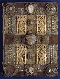 Keywords: MCC-61050 Evangeliarium (Lebuïnuscodex) (1).jpg Artwork nl Anonymous Noordoost-Frankrijk Anonymous Rijnland Anonymous Maasland nl De kern van de boekband van de Lebuïnuscodex wordt gevormd door twee eikenhouten platten De rug en het achterplat zijn overtrokken met zeemleer Het voorplat is rijkelijk versierd met verguld zilversmeedwerk reliëfs van walrustand en verscheidene stenen De compositie van de bekleding van het voorplat wordt bepaald door een verguld zilveren filigraankruis Aan de uiteinden van de kruisarmen bevinden zich vierpassen met overhoeks vierkant eveneens met filigraan gedecoreerd Hiervan zijn er slechts twee bewaard gebleven en wel die aan de verticale kruisarmen Zij bevatten tevens nog de oorspronkelijke versiering bestaande uit een filigraanmedaillon met een pseudo-camee van respectievelijk een mannen- en een vrouwenhoofd in profiel Het snijpunt van het kruis wordt ingenomen door een ver vooruitstekend Bacchuskopje in chalcedoon te herkennen aan de kleine druiventrosjes in zijn haartooi Het kopje is gevat in een filigraanmedaillon welke op zijn beurt weer is geplaatst op een vierpas van filigraanwerk Op elk van de kruisarmen bevindt zich een ovale steen 'en cabochon' op een medaillon met filigraan Het filigraanwerk van kruis en sierstukken is in de vorm van visblazen In de ruimten tussen de kruisarmen zijn rechthoekige reliëfs van walrustand aangebracht met de vier evangelisten en hun symbool De reliëfs hebben de volgende afmetingen H 10 0 x B 5 5 cm Van links boven naar rechts onder betreft het Mattheus met de engel Johannes met de adelaar Marcus met de gevleugelde leeuw en Lucas met de gevleugelde os De figuren zijn paarsgewijs als elkaars spiegelbeeld ten opzichte van de middenas geplaatst Mattheus en Johannes zitten vrijwel geheel frontaal terwijl Marcus en Lucas meer in profiel zijn afgebeeld Qua opbouw verschillen de vier reliëfs nauwelijks van elkaar Binnen een rand van vierlobbige blaadjes verheffen zich twee zuilen met een basis een kapiteel en een dekplaat Hierop rust een rondboog geflankeerd door twee torens en afgedekt met een fronton dat boven Mattheus en Johannes boogvormig en boven Marcus en Lucas driehoekig is Onder deze overhuiving zitten de evangelisten gekleed in een lang gewaad en mantel met gekruiste benen aan een lessenaar hun blote voeten rustend op een bankje Allen zijn baardeloos en voorzien van een nimbus Voorts houden ze een pen in hun rechterhand terwijl hun linker op een boek ligt of gebarend is opgeheven Boven elk van de evangelisten verschijnt in de opening van het fronton zijn symbool met een spreukband Dit rijkelijk gedecoreerde middenveld wordt omlijst door sierbanden van verguld koper De opbouw van de sierlijsten is steeds dezelfde een opstaande smalle band die op regelmatige afstanden is voorzien van holten met aan weerszijden een brede strook voorzien van een gestanst motief Aan de lange zijden van de boekband bestaat het motief uit palmetten aan de korte zijden uit rozetten Van deze laatstgenoemde stroken ontbreekt steeds de buitenste rand Bij alle stroken met palmettenmotief wijzen de palmetten naar links met uitzondering van de buitenste strook rechtsboven die het motief in tegengestelde richting toont Verguld zilveren rozetten op de hoeken van het voorplat omgeven door een smalle rand van filigraanwerk met cirkelmotief en bekroond met een 'en cabochon' gezette steen completeren het geheel Van de rozet links onder ontbreekt de steen en is slechts de buitenste rand over Aan de voorzijde van de boekband bevinden zich nog de rudimenten van twee sluitingen between u'825' u'1000' u'1150' u'850' u'1199' u'1199' nl perkament eikenhout zilver goud koper walrustand chalcedoon glas leer Size 35 5 26 0 cm nl Hoogte 35 5cm Breedte 26 0cm Diepte 13 5cm Institution Museum Catharijneconvent object history exhibition history credit line nl Foto Museum Catharijneconvent Utrecht foto HetFotoAtelier Peter Rothengatter Reproduction title nl Voorzijde boekband accession number Object number 61050 Inventory number ABM h1 place of creation https //www catharijneconvent nl/adlib/61050/ View this work on the website of Museum Catharijneconvent Museum Catharijneconvent Cc-zero <gallery> File MCC-61050_Evangeliarium_Lebuïnuscodex_ 11 jpg File MCC-61050_Evangeliarium_Lebuïnuscodex_ 172 jpg File MCC-61050_Evangeliarium_Lebuïnuscodex_ 212 jpg File MCC-61050_Evangeliarium_Lebuïnuscodex_ 61 jpg File MCC-61050_Evangeliarium_Lebuïnuscodex_ 12 jpg File MCC-61050_Evangeliarium_Lebuïnuscodex_ 213 jpg File MCC-61050_Evangeliarium_Lebuïnuscodex_ 56 jpg File MCC-61050_Evangeliarium_Lebuïnuscodex_ 232 jpg File MCC-61050_Evangeliarium_Lebuïnuscodex_ 93 jpg File MCC-61050_Evangeliarium_Lebuïnuscodex_ 99 jpg File MCC-61050_Evangeliarium_Lebuïnuscodex_ 184 jpg File MCC-61050_Evangeliarium_Lebuïnuscodex_ 64 jpg File MCC-61050_Evangeliarium_Lebuïnuscodex_ 299 jpg File MCC-61050_Evangeliarium_Lebuïnuscodex_ 86 jpg File MCC-61050_Evangeliarium_Lebuïnuscodex_ 260 jpg File MCC-61050_Evangeliarium_Lebuïnuscodex_ 159 jpg File MCC-61050_Evangeliarium_Lebuïnuscodex_ 247 jpg File MCC-61050_Evangeliarium_Lebuïnuscodex_ 180 jpg File MCC-61050_Evangeliarium_Lebuïnuscodex_ 121 jpg File MCC-61050_Evangeliarium_Lebuïnuscodex_ 315 jpg File MCC-61050_Evangeliarium_Lebuïnuscodex_ 284 jpg File MCC-61050_Evangeliarium_Lebuïnuscodex_ 33 jpg File MCC-61050_Evangeliarium_Lebuïnuscodex_ 44 jpg File MCC-61050_Evangeliarium_Lebuïnuscodex_ 258 jpg File MCC-61050_Evangeliarium_Lebuïnuscodex_ 237 jpg File MCC-61050_Evangeliarium_Lebuïnuscodex_ 20 jpg File MCC-61050_Evangeliarium_Lebuïnuscodex_ 220 jpg File MCC-61050_Evangeliarium_Lebuïnuscodex_ 279 jpg File MCC-61050_Evangeliarium_Lebuïnuscodex_ 183 jpg File MCC-61050_Evangeliarium_Lebuïnuscodex_ 60 jpg File MCC-61050_Evangeliarium_Lebuïnuscodex_ 166 jpg File MCC-61050_Evangeliarium_Lebuïnuscodex_ 97 jpg File MCC-61050_Evangeliarium_Lebuïnuscodex_ 71 jpg File MCC-61050_Evangeliarium_Lebuïnuscodex_ 132 jpg