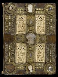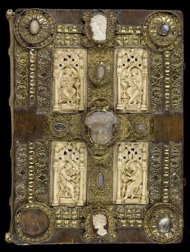 Keywords: MCC-61050 Evangeliarium (Lebuïnuscodex) (315).jpg Artwork nl Anonymous Noordoost-Frankrijk Anonymous Rijnland Anonymous Maasland nl De kern van de boekband van de Lebuïnuscodex wordt gevormd door twee eikenhouten platten De rug en het achterplat zijn overtrokken met zeemleer Het voorplat is rijkelijk versierd met verguld zilversmeedwerk reliëfs van walrustand en verscheidene stenen De compositie van de bekleding van het voorplat wordt bepaald door een verguld zilveren filigraankruis Aan de uiteinden van de kruisarmen bevinden zich vierpassen met overhoeks vierkant eveneens met filigraan gedecoreerd Hiervan zijn er slechts twee bewaard gebleven en wel die aan de verticale kruisarmen Zij bevatten tevens nog de oorspronkelijke versiering bestaande uit een filigraanmedaillon met een pseudo-camee van respectievelijk een mannen- en een vrouwenhoofd in profiel Het snijpunt van het kruis wordt ingenomen door een ver vooruitstekend Bacchuskopje in chalcedoon te herkennen aan de kleine druiventrosjes in zijn haartooi Het kopje is gevat in een filigraanmedaillon welke op zijn beurt weer is geplaatst op een vierpas van filigraanwerk Op elk van de kruisarmen bevindt zich een ovale steen 'en cabochon' op een medaillon met filigraan Het filigraanwerk van kruis en sierstukken is in de vorm van visblazen In de ruimten tussen de kruisarmen zijn rechthoekige reliëfs van walrustand aangebracht met de vier evangelisten en hun symbool De reliëfs hebben de volgende afmetingen H 10 0 x B 5 5 cm Van links boven naar rechts onder betreft het Mattheus met de engel Johannes met de adelaar Marcus met de gevleugelde leeuw en Lucas met de gevleugelde os De figuren zijn paarsgewijs als elkaars spiegelbeeld ten opzichte van de middenas geplaatst Mattheus en Johannes zitten vrijwel geheel frontaal terwijl Marcus en Lucas meer in profiel zijn afgebeeld Qua opbouw verschillen de vier reliëfs nauwelijks van elkaar Binnen een rand van vierlobbige blaadjes verheffen zich twee zuilen met een basis een kapiteel en een dekplaat Hierop rust een rondboog geflankeerd door twee torens en afgedekt met een fronton dat boven Mattheus en Johannes boogvormig en boven Marcus en Lucas driehoekig is Onder deze overhuiving zitten de evangelisten gekleed in een lang gewaad en mantel met gekruiste benen aan een lessenaar hun blote voeten rustend op een bankje Allen zijn baardeloos en voorzien van een nimbus Voorts houden ze een pen in hun rechterhand terwijl hun linker op een boek ligt of gebarend is opgeheven Boven elk van de evangelisten verschijnt in de opening van het fronton zijn symbool met een spreukband Dit rijkelijk gedecoreerde middenveld wordt omlijst door sierbanden van verguld koper De opbouw van de sierlijsten is steeds dezelfde een opstaande smalle band die op regelmatige afstanden is voorzien van holten met aan weerszijden een brede strook voorzien van een gestanst motief Aan de lange zijden van de boekband bestaat het motief uit palmetten aan de korte zijden uit rozetten Van deze laatstgenoemde stroken ontbreekt steeds de buitenste rand Bij alle stroken met palmettenmotief wijzen de palmetten naar links met uitzondering van de buitenste strook rechtsboven die het motief in tegengestelde richting toont Verguld zilveren rozetten op de hoeken van het voorplat omgeven door een smalle rand van filigraanwerk met cirkelmotief en bekroond met een 'en cabochon' gezette steen completeren het geheel Van de rozet links onder ontbreekt de steen en is slechts de buitenste rand over Aan de voorzijde van de boekband bevinden zich nog de rudimenten van twee sluitingen between u'825' u'1000' u'1150' u'850' u'1199' u'1199' nl perkament eikenhout zilver goud koper walrustand chalcedoon glas leer Size 35 5 26 0 cm nl Hoogte 35 5cm Breedte 26 0cm Diepte 13 5cm Institution Museum Catharijneconvent object history exhibition history credit line nl Foto Museum Catharijneconvent Utrecht foto HetFotoAtelier Peter Rothengatter Reproduction title nl Boekband voorzijde accession number Object number 61050 Inventory number ABM h1 place of creation https //www catharijneconvent nl/adlib/61050/ View this work on the website of Museum Catharijneconvent Museum Catharijneconvent Cc-zero <gallery> File MCC-61050_Evangeliarium_Lebuïnuscodex_ 11 jpg File MCC-61050_Evangeliarium_Lebuïnuscodex_ 172 jpg File MCC-61050_Evangeliarium_Lebuïnuscodex_ 212 jpg File MCC-61050_Evangeliarium_Lebuïnuscodex_ 61 jpg File MCC-61050_Evangeliarium_Lebuïnuscodex_ 12 jpg File MCC-61050_Evangeliarium_Lebuïnuscodex_ 213 jpg File MCC-61050_Evangeliarium_Lebuïnuscodex_ 56 jpg File MCC-61050_Evangeliarium_Lebuïnuscodex_ 232 jpg File MCC-61050_Evangeliarium_Lebuïnuscodex_ 93 jpg File MCC-61050_Evangeliarium_Lebuïnuscodex_ 99 jpg File MCC-61050_Evangeliarium_Lebuïnuscodex_ 184 jpg File MCC-61050_Evangeliarium_Lebuïnuscodex_ 64 jpg File MCC-61050_Evangeliarium_Lebuïnuscodex_ 299 jpg File MCC-61050_Evangeliarium_Lebuïnuscodex_ 86 jpg File MCC-61050_Evangeliarium_Lebuïnuscodex_ 260 jpg File MCC-61050_Evangeliarium_Lebuïnuscodex_ 159 jpg File MCC-61050_Evangeliarium_Lebuïnuscodex_ 247 jpg File MCC-61050_Evangeliarium_Lebuïnuscodex_ 180 jpg File MCC-61050_Evangeliarium_Lebuïnuscodex_ 121 jpg File MCC-61050_Evangeliarium_Lebuïnuscodex_ 315 jpg File MCC-61050_Evangeliarium_Lebuïnuscodex_ 284 jpg File MCC-61050_Evangeliarium_Lebuïnuscodex_ 33 jpg File MCC-61050_Evangeliarium_Lebuïnuscodex_ 44 jpg File MCC-61050_Evangeliarium_Lebuïnuscodex_ 258 jpg File MCC-61050_Evangeliarium_Lebuïnuscodex_ 237 jpg File MCC-61050_Evangeliarium_Lebuïnuscodex_ 20 jpg File MCC-61050_Evangeliarium_Lebuïnuscodex_ 220 jpg File MCC-61050_Evangeliarium_Lebuïnuscodex_ 279 jpg File MCC-61050_Evangeliarium_Lebuïnuscodex_ 183 jpg File MCC-61050_Evangeliarium_Lebuïnuscodex_ 60 jpg File MCC-61050_Evangeliarium_Lebuïnuscodex_ 166 jpg File MCC-61050_Evangeliarium_Lebuïnuscodex_ 97 jpg File MCC-61050_Evangeliarium_Lebuïnuscodex_ 71 jpg File MCC-61050_Evangeliarium_Lebuïnuscodex_ 132 j