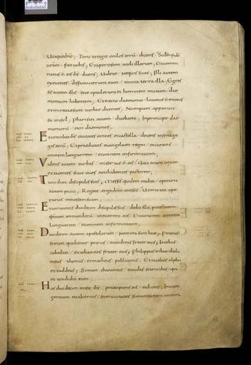 Keywords: MCC-61050 Evangeliarium (Lebuïnuscodex) (34).jpg Artwork nl Anonymous Noordoost-Frankrijk Anonymous Rijnland Anonymous Maasland nl De kern van de boekband van de Lebuïnuscodex wordt gevormd door twee eikenhouten platten De rug en het achterplat zijn overtrokken met zeemleer Het voorplat is rijkelijk versierd met verguld zilversmeedwerk reliëfs van walrustand en verscheidene stenen De compositie van de bekleding van het voorplat wordt bepaald door een verguld zilveren filigraankruis Aan de uiteinden van de kruisarmen bevinden zich vierpassen met overhoeks vierkant eveneens met filigraan gedecoreerd Hiervan zijn er slechts twee bewaard gebleven en wel die aan de verticale kruisarmen Zij bevatten tevens nog de oorspronkelijke versiering bestaande uit een filigraanmedaillon met een pseudo-camee van respectievelijk een mannen- en een vrouwenhoofd in profiel Het snijpunt van het kruis wordt ingenomen door een ver vooruitstekend Bacchuskopje in chalcedoon te herkennen aan de kleine druiventrosjes in zijn haartooi Het kopje is gevat in een filigraanmedaillon welke op zijn beurt weer is geplaatst op een vierpas van filigraanwerk Op elk van de kruisarmen bevindt zich een ovale steen 'en cabochon' op een medaillon met filigraan Het filigraanwerk van kruis en sierstukken is in de vorm van visblazen In de ruimten tussen de kruisarmen zijn rechthoekige reliëfs van walrustand aangebracht met de vier evangelisten en hun symbool De reliëfs hebben de volgende afmetingen H 10 0 x B 5 5 cm Van links boven naar rechts onder betreft het Mattheus met de engel Johannes met de adelaar Marcus met de gevleugelde leeuw en Lucas met de gevleugelde os De figuren zijn paarsgewijs als elkaars spiegelbeeld ten opzichte van de middenas geplaatst Mattheus en Johannes zitten vrijwel geheel frontaal terwijl Marcus en Lucas meer in profiel zijn afgebeeld Qua opbouw verschillen de vier reliëfs nauwelijks van elkaar Binnen een rand van vierlobbige blaadjes verheffen zich twee zuilen met een basis een kapiteel en een dekplaat Hierop rust een rondboog geflankeerd door twee torens en afgedekt met een fronton dat boven Mattheus en Johannes boogvormig en boven Marcus en Lucas driehoekig is Onder deze overhuiving zitten de evangelisten gekleed in een lang gewaad en mantel met gekruiste benen aan een lessenaar hun blote voeten rustend op een bankje Allen zijn baardeloos en voorzien van een nimbus Voorts houden ze een pen in hun rechterhand terwijl hun linker op een boek ligt of gebarend is opgeheven Boven elk van de evangelisten verschijnt in de opening van het fronton zijn symbool met een spreukband Dit rijkelijk gedecoreerde middenveld wordt omlijst door sierbanden van verguld koper De opbouw van de sierlijsten is steeds dezelfde een opstaande smalle band die op regelmatige afstanden is voorzien van holten met aan weerszijden een brede strook voorzien van een gestanst motief Aan de lange zijden van de boekband bestaat het motief uit palmetten aan de korte zijden uit rozetten Van deze laatstgenoemde stroken ontbreekt steeds de buitenste rand Bij alle stroken met palmettenmotief wijzen de palmetten naar links met uitzondering van de buitenste strook rechtsboven die het motief in tegengestelde richting toont Verguld zilveren rozetten op de hoeken van het voorplat omgeven door een smalle rand van filigraanwerk met cirkelmotief en bekroond met een 'en cabochon' gezette steen completeren het geheel Van de rozet links onder ontbreekt de steen en is slechts de buitenste rand over Aan de voorzijde van de boekband bevinden zich nog de rudimenten van twee sluitingen between u'825' u'1000' u'1150' u'850' u'1199' u'1199' nl perkament eikenhout zilver goud koper walrustand chalcedoon glas leer Size 35 5 26 0 cm nl Hoogte 35 5cm Breedte 26 0cm Diepte 13 5cm Institution Museum Catharijneconvent object history exhibition history credit line nl Foto Museum Catharijneconvent Utrecht foto HetFotoAtelier Peter Rothengatter accession number Object number 61050 Inventory number ABM h1 place of creation https //www catharijneconvent nl/adlib/61050/ View this work on the website of Museum Catharijneconvent Museum Catharijneconvent Cc-zero <gallery> File MCC-61050_Evangeliarium_Lebuïnuscodex_ 11 jpg File MCC-61050_Evangeliarium_Lebuïnuscodex_ 172 jpg File MCC-61050_Evangeliarium_Lebuïnuscodex_ 212 jpg File MCC-61050_Evangeliarium_Lebuïnuscodex_ 61 jpg File MCC-61050_Evangeliarium_Lebuïnuscodex_ 12 jpg File MCC-61050_Evangeliarium_Lebuïnuscodex_ 213 jpg File MCC-61050_Evangeliarium_Lebuïnuscodex_ 56 jpg File MCC-61050_Evangeliarium_Lebuïnuscodex_ 232 jpg File MCC-61050_Evangeliarium_Lebuïnuscodex_ 93 jpg File MCC-61050_Evangeliarium_Lebuïnuscodex_ 99 jpg File MCC-61050_Evangeliarium_Lebuïnuscodex_ 184 jpg File MCC-61050_Evangeliarium_Lebuïnuscodex_ 64 jpg File MCC-61050_Evangeliarium_Lebuïnuscodex_ 299 jpg File MCC-61050_Evangeliarium_Lebuïnuscodex_ 86 jpg File MCC-61050_Evangeliarium_Lebuïnuscodex_ 260 jpg File MCC-61050_Evangeliarium_Lebuïnuscodex_ 159 jpg File MCC-61050_Evangeliarium_Lebuïnuscodex_ 247 jpg File MCC-61050_Evangeliarium_Lebuïnuscodex_ 180 jpg File MCC-61050_Evangeliarium_Lebuïnuscodex_ 121 jpg File MCC-61050_Evangeliarium_Lebuïnuscodex_ 315 jpg File MCC-61050_Evangeliarium_Lebuïnuscodex_ 284 jpg File MCC-61050_Evangeliarium_Lebuïnuscodex_ 33 jpg File MCC-61050_Evangeliarium_Lebuïnuscodex_ 44 jpg File MCC-61050_Evangeliarium_Lebuïnuscodex_ 258 jpg File MCC-61050_Evangeliarium_Lebuïnuscodex_ 237 jpg File MCC-61050_Evangeliarium_Lebuïnuscodex_ 20 jpg File MCC-61050_Evangeliarium_Lebuïnuscodex_ 220 jpg File MCC-61050_Evangeliarium_Lebuïnuscodex_ 279 jpg File MCC-61050_Evangeliarium_Lebuïnuscodex_ 183 jpg File MCC-61050_Evangeliarium_Lebuïnuscodex_ 60 jpg File MCC-61050_Evangeliarium_Lebuïnuscodex_ 166 jpg File MCC-61050_Evangeliarium_Lebuïnuscodex_ 97 jpg File MCC-61050_Evangeliarium_Lebuïnuscodex_ 71 jpg File MCC-61050_Evangeliarium_Lebuïnuscodex_ 132 jpg File MCC-61050_Evangeliarium_Lebuïnusc