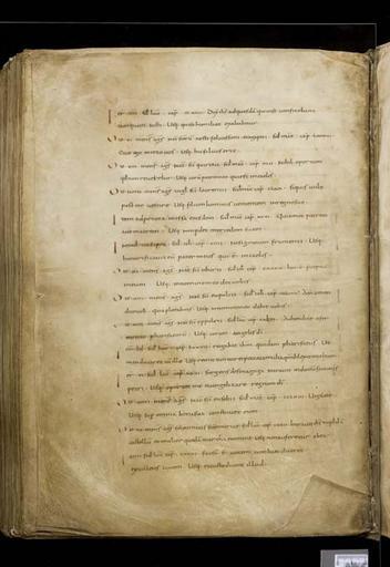 | Keywords: MCC-61050 Evangeliarium (Lebuïnuscodex) (302).jpg Artwork nl Anonymous Noordoost-Frankrijk Anonymous Rijnland Anonymous Maasland nl De kern van de boekband van de Lebuïnuscodex wordt gevormd door twee eikenhouten platten De rug en het achterplat zijn overtrokken met zeemleer Het voorplat is rijkelijk versierd met verguld zilversmeedwerk reliëfs van walrustand en verscheidene stenen De compositie van de bekleding van het voorplat wordt bepaald door een verguld zilveren filigraankruis Aan de uiteinden van de kruisarmen bevinden zich vierpassen met overhoeks vierkant eveneens met filigraan gedecoreerd Hiervan zijn er slechts twee bewaard gebleven en wel die aan de verticale kruisarmen Zij bevatten tevens nog de oorspronkelijke versiering bestaande uit een filigraanmedaillon met een pseudo-camee van respectievelijk een mannen- en een vrouwenhoofd in profiel Het snijpunt van het kruis wordt ingenomen door een ver vooruitstekend Bacchuskopje in chalcedoon te herkennen aan de kleine druiventrosjes in zijn haartooi Het kopje is gevat in een filigraanmedaillon welke op zijn beurt weer is geplaatst op een vierpas van filigraanwerk Op elk van de kruisarmen bevindt zich een ovale steen 'en cabochon' op een medaillon met filigraan Het filigraanwerk van kruis en sierstukken is in de vorm van visblazen In de ruimten tussen de kruisarmen zijn rechthoekige reliëfs van walrustand aangebracht met de vier evangelisten en hun symbool De reliëfs hebben de volgende afmetingen H 10 0 x B 5 5 cm Van links boven naar rechts onder betreft het Mattheus met de engel Johannes met de adelaar Marcus met de gevleugelde leeuw en Lucas met de gevleugelde os De figuren zijn paarsgewijs als elkaars spiegelbeeld ten opzichte van de middenas geplaatst Mattheus en Johannes zitten vrijwel geheel frontaal terwijl Marcus en Lucas meer in profiel zijn afgebeeld Qua opbouw verschillen de vier reliëfs nauwelijks van elkaar Binnen een rand van vierlobbige blaadjes verheffen zich twee zuilen met een basis een kapiteel en een dekplaat Hierop rust een rondboog geflankeerd door twee torens en afgedekt met een fronton dat boven Mattheus en Johannes boogvormig en boven Marcus en Lucas driehoekig is Onder deze overhuiving zitten de evangelisten gekleed in een lang gewaad en mantel met gekruiste benen aan een lessenaar hun blote voeten rustend op een bankje Allen zijn baardeloos en voorzien van een nimbus Voorts houden ze een pen in hun rechterhand terwijl hun linker op een boek ligt of gebarend is opgeheven Boven elk van de evangelisten verschijnt in de opening van het fronton zijn symbool met een spreukband Dit rijkelijk gedecoreerde middenveld wordt omlijst door sierbanden van verguld koper De opbouw van de sierlijsten is steeds dezelfde een opstaande smalle band die op regelmatige afstanden is voorzien van holten met aan weerszijden een brede strook voorzien van een gestanst motief Aan de lange zijden van de boekband bestaat het motief uit palmetten aan de korte zijden uit rozetten Van deze laatstgenoemde stroken ontbreekt steeds de buitenste rand Bij alle stroken met palmettenmotief wijzen de palmetten naar links met uitzondering van de buitenste strook rechtsboven die het motief in tegengestelde richting toont Verguld zilveren rozetten op de hoeken van het voorplat omgeven door een smalle rand van filigraanwerk met cirkelmotief en bekroond met een 'en cabochon' gezette steen completeren het geheel Van de rozet links onder ontbreekt de steen en is slechts de buitenste rand over Aan de voorzijde van de boekband bevinden zich nog de rudimenten van twee sluitingen between u'825' u'1000' u'1150' u'850' u'1199' u'1199' nl perkament eikenhout zilver goud koper walrustand chalcedoon glas leer Size 35 5 26 0 cm nl Hoogte 35 5cm Breedte 26 0cm Diepte 13 5cm Institution Museum Catharijneconvent object history exhibition history credit line nl Foto Museum Catharijneconvent Utrecht foto HetFotoAtelier Peter Rothengatter accession number Object number 61050 Inventory number ABM h1 place of creation https //www catharijneconvent nl/adlib/61050/ View this work on the website of Museum Catharijneconvent Museum Catharijneconvent Cc-zero <gallery> File MCC-61050_Evangeliarium_Lebuïnuscodex_ 11 jpg File MCC-61050_Evangeliarium_Lebuïnuscodex_ 172 jpg File MCC-61050_Evangeliarium_Lebuïnuscodex_ 212 jpg File MCC-61050_Evangeliarium_Lebuïnuscodex_ 61 jpg File MCC-61050_Evangeliarium_Lebuïnuscodex_ 12 jpg File MCC-61050_Evangeliarium_Lebuïnuscodex_ 213 jpg File MCC-61050_Evangeliarium_Lebuïnuscodex_ 56 jpg File MCC-61050_Evangeliarium_Lebuïnuscodex_ 232 jpg File MCC-61050_Evangeliarium_Lebuïnuscodex_ 93 jpg File MCC-61050_Evangeliarium_Lebuïnuscodex_ 99 jpg File MCC-61050_Evangeliarium_Lebuïnuscodex_ 184 jpg File MCC-61050_Evangeliarium_Lebuïnuscodex_ 64 jpg File MCC-61050_Evangeliarium_Lebuïnuscodex_ 299 jpg File MCC-61050_Evangeliarium_Lebuïnuscodex_ 86 jpg File MCC-61050_Evangeliarium_Lebuïnuscodex_ 260 jpg File MCC-61050_Evangeliarium_Lebuïnuscodex_ 159 jpg File MCC-61050_Evangeliarium_Lebuïnuscodex_ 247 jpg File MCC-61050_Evangeliarium_Lebuïnuscodex_ 180 jpg File MCC-61050_Evangeliarium_Lebuïnuscodex_ 121 jpg File MCC-61050_Evangeliarium_Lebuïnuscodex_ 315 jpg File MCC-61050_Evangeliarium_Lebuïnuscodex_ 284 jpg File MCC-61050_Evangeliarium_Lebuïnuscodex_ 33 jpg File MCC-61050_Evangeliarium_Lebuïnuscodex_ 44 jpg File MCC-61050_Evangeliarium_Lebuïnuscodex_ 258 jpg File MCC-61050_Evangeliarium_Lebuïnuscodex_ 237 jpg File MCC-61050_Evangeliarium_Lebuïnuscodex_ 20 jpg File MCC-61050_Evangeliarium_Lebuïnuscodex_ 220 jpg File MCC-61050_Evangeliarium_Lebuïnuscodex_ 279 jpg File MCC-61050_Evangeliarium_Lebuïnuscodex_ 183 jpg File MCC-61050_Evangeliarium_Lebuïnuscodex_ 60 jpg File MCC-61050_Evangeliarium_Lebuïnuscodex_ 166 jpg File MCC-61050_Evangeliarium_Lebuïnuscodex_ 97 jpg File MCC-61050_Evangeliarium_Lebuïnuscodex_ 71 jpg File MCC-61050_Evangeliarium_Lebuïnuscodex_ 132 jpg File MCC-61050_Evangeliarium_Lebuïn