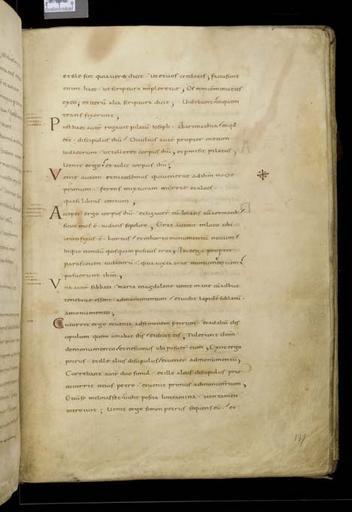 Keywords: MCC-61050 Evangeliarium (Lebuïnuscodex) (279).jpg Artwork nl Anonymous Noordoost-Frankrijk Anonymous Rijnland Anonymous Maasland nl De kern van de boekband van de Lebuïnuscodex wordt gevormd door twee eikenhouten platten De rug en het achterplat zijn overtrokken met zeemleer Het voorplat is rijkelijk versierd met verguld zilversmeedwerk reliëfs van walrustand en verscheidene stenen De compositie van de bekleding van het voorplat wordt bepaald door een verguld zilveren filigraankruis Aan de uiteinden van de kruisarmen bevinden zich vierpassen met overhoeks vierkant eveneens met filigraan gedecoreerd Hiervan zijn er slechts twee bewaard gebleven en wel die aan de verticale kruisarmen Zij bevatten tevens nog de oorspronkelijke versiering bestaande uit een filigraanmedaillon met een pseudo-camee van respectievelijk een mannen- en een vrouwenhoofd in profiel Het snijpunt van het kruis wordt ingenomen door een ver vooruitstekend Bacchuskopje in chalcedoon te herkennen aan de kleine druiventrosjes in zijn haartooi Het kopje is gevat in een filigraanmedaillon welke op zijn beurt weer is geplaatst op een vierpas van filigraanwerk Op elk van de kruisarmen bevindt zich een ovale steen 'en cabochon' op een medaillon met filigraan Het filigraanwerk van kruis en sierstukken is in de vorm van visblazen In de ruimten tussen de kruisarmen zijn rechthoekige reliëfs van walrustand aangebracht met de vier evangelisten en hun symbool De reliëfs hebben de volgende afmetingen H 10 0 x B 5 5 cm Van links boven naar rechts onder betreft het Mattheus met de engel Johannes met de adelaar Marcus met de gevleugelde leeuw en Lucas met de gevleugelde os De figuren zijn paarsgewijs als elkaars spiegelbeeld ten opzichte van de middenas geplaatst Mattheus en Johannes zitten vrijwel geheel frontaal terwijl Marcus en Lucas meer in profiel zijn afgebeeld Qua opbouw verschillen de vier reliëfs nauwelijks van elkaar Binnen een rand van vierlobbige blaadjes verheffen zich twee zuilen met een basis een kapiteel en een dekplaat Hierop rust een rondboog geflankeerd door twee torens en afgedekt met een fronton dat boven Mattheus en Johannes boogvormig en boven Marcus en Lucas driehoekig is Onder deze overhuiving zitten de evangelisten gekleed in een lang gewaad en mantel met gekruiste benen aan een lessenaar hun blote voeten rustend op een bankje Allen zijn baardeloos en voorzien van een nimbus Voorts houden ze een pen in hun rechterhand terwijl hun linker op een boek ligt of gebarend is opgeheven Boven elk van de evangelisten verschijnt in de opening van het fronton zijn symbool met een spreukband Dit rijkelijk gedecoreerde middenveld wordt omlijst door sierbanden van verguld koper De opbouw van de sierlijsten is steeds dezelfde een opstaande smalle band die op regelmatige afstanden is voorzien van holten met aan weerszijden een brede strook voorzien van een gestanst motief Aan de lange zijden van de boekband bestaat het motief uit palmetten aan de korte zijden uit rozetten Van deze laatstgenoemde stroken ontbreekt steeds de buitenste rand Bij alle stroken met palmettenmotief wijzen de palmetten naar links met uitzondering van de buitenste strook rechtsboven die het motief in tegengestelde richting toont Verguld zilveren rozetten op de hoeken van het voorplat omgeven door een smalle rand van filigraanwerk met cirkelmotief en bekroond met een 'en cabochon' gezette steen completeren het geheel Van de rozet links onder ontbreekt de steen en is slechts de buitenste rand over Aan de voorzijde van de boekband bevinden zich nog de rudimenten van twee sluitingen between u'825' u'1000' u'1150' u'850' u'1199' u'1199' nl perkament eikenhout zilver goud koper walrustand chalcedoon glas leer Size 35 5 26 0 cm nl Hoogte 35 5cm Breedte 26 0cm Diepte 13 5cm Institution Museum Catharijneconvent object history exhibition history credit line nl Foto Museum Catharijneconvent Utrecht foto HetFotoAtelier Peter Rothengatter accession number Object number 61050 Inventory number ABM h1 place of creation https //www catharijneconvent nl/adlib/61050/ View this work on the website of Museum Catharijneconvent Museum Catharijneconvent Cc-zero <gallery> File MCC-61050_Evangeliarium_Lebuïnuscodex_ 11 jpg File MCC-61050_Evangeliarium_Lebuïnuscodex_ 172 jpg File MCC-61050_Evangeliarium_Lebuïnuscodex_ 212 jpg File MCC-61050_Evangeliarium_Lebuïnuscodex_ 61 jpg File MCC-61050_Evangeliarium_Lebuïnuscodex_ 12 jpg File MCC-61050_Evangeliarium_Lebuïnuscodex_ 213 jpg File MCC-61050_Evangeliarium_Lebuïnuscodex_ 56 jpg File MCC-61050_Evangeliarium_Lebuïnuscodex_ 232 jpg File MCC-61050_Evangeliarium_Lebuïnuscodex_ 93 jpg File MCC-61050_Evangeliarium_Lebuïnuscodex_ 99 jpg File MCC-61050_Evangeliarium_Lebuïnuscodex_ 184 jpg File MCC-61050_Evangeliarium_Lebuïnuscodex_ 64 jpg File MCC-61050_Evangeliarium_Lebuïnuscodex_ 299 jpg File MCC-61050_Evangeliarium_Lebuïnuscodex_ 86 jpg File MCC-61050_Evangeliarium_Lebuïnuscodex_ 260 jpg File MCC-61050_Evangeliarium_Lebuïnuscodex_ 159 jpg File MCC-61050_Evangeliarium_Lebuïnuscodex_ 247 jpg File MCC-61050_Evangeliarium_Lebuïnuscodex_ 180 jpg File MCC-61050_Evangeliarium_Lebuïnuscodex_ 121 jpg File MCC-61050_Evangeliarium_Lebuïnuscodex_ 315 jpg File MCC-61050_Evangeliarium_Lebuïnuscodex_ 284 jpg File MCC-61050_Evangeliarium_Lebuïnuscodex_ 33 jpg File MCC-61050_Evangeliarium_Lebuïnuscodex_ 44 jpg File MCC-61050_Evangeliarium_Lebuïnuscodex_ 258 jpg File MCC-61050_Evangeliarium_Lebuïnuscodex_ 237 jpg File MCC-61050_Evangeliarium_Lebuïnuscodex_ 20 jpg File MCC-61050_Evangeliarium_Lebuïnuscodex_ 220 jpg File MCC-61050_Evangeliarium_Lebuïnuscodex_ 279 jpg File MCC-61050_Evangeliarium_Lebuïnuscodex_ 183 jpg File MCC-61050_Evangeliarium_Lebuïnuscodex_ 60 jpg File MCC-61050_Evangeliarium_Lebuïnuscodex_ 166 jpg File MCC-61050_Evangeliarium_Lebuïnuscodex_ 97 jpg File MCC-61050_Evangeliarium_Lebuïnuscodex_ 71 jpg File MCC-61050_Evangeliarium_Lebuïnuscodex_ 132 jpg File MCC-61050_Evangeliarium_Lebuïnus