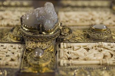 | Keywords: MCC-61050 Evangeliarium (Lebuïnuscodex) (320).jpg Artwork nl Anonymous Noordoost-Frankrijk Anonymous Rijnland Anonymous Maasland nl De kern van de boekband van de Lebuïnuscodex wordt gevormd door twee eikenhouten platten De rug en het achterplat zijn overtrokken met zeemleer Het voorplat is rijkelijk versierd met verguld zilversmeedwerk reliëfs van walrustand en verscheidene stenen De compositie van de bekleding van het voorplat wordt bepaald door een verguld zilveren filigraankruis Aan de uiteinden van de kruisarmen bevinden zich vierpassen met overhoeks vierkant eveneens met filigraan gedecoreerd Hiervan zijn er slechts twee bewaard gebleven en wel die aan de verticale kruisarmen Zij bevatten tevens nog de oorspronkelijke versiering bestaande uit een filigraanmedaillon met een pseudo-camee van respectievelijk een mannen- en een vrouwenhoofd in profiel Het snijpunt van het kruis wordt ingenomen door een ver vooruitstekend Bacchuskopje in chalcedoon te herkennen aan de kleine druiventrosjes in zijn haartooi Het kopje is gevat in een filigraanmedaillon welke op zijn beurt weer is geplaatst op een vierpas van filigraanwerk Op elk van de kruisarmen bevindt zich een ovale steen 'en cabochon' op een medaillon met filigraan Het filigraanwerk van kruis en sierstukken is in de vorm van visblazen In de ruimten tussen de kruisarmen zijn rechthoekige reliëfs van walrustand aangebracht met de vier evangelisten en hun symbool De reliëfs hebben de volgende afmetingen H 10 0 x B 5 5 cm Van links boven naar rechts onder betreft het Mattheus met de engel Johannes met de adelaar Marcus met de gevleugelde leeuw en Lucas met de gevleugelde os De figuren zijn paarsgewijs als elkaars spiegelbeeld ten opzichte van de middenas geplaatst Mattheus en Johannes zitten vrijwel geheel frontaal terwijl Marcus en Lucas meer in profiel zijn afgebeeld Qua opbouw verschillen de vier reliëfs nauwelijks van elkaar Binnen een rand van vierlobbige blaadjes verheffen zich twee zuilen met een basis een kapiteel en een dekplaat Hierop rust een rondboog geflankeerd door twee torens en afgedekt met een fronton dat boven Mattheus en Johannes boogvormig en boven Marcus en Lucas driehoekig is Onder deze overhuiving zitten de evangelisten gekleed in een lang gewaad en mantel met gekruiste benen aan een lessenaar hun blote voeten rustend op een bankje Allen zijn baardeloos en voorzien van een nimbus Voorts houden ze een pen in hun rechterhand terwijl hun linker op een boek ligt of gebarend is opgeheven Boven elk van de evangelisten verschijnt in de opening van het fronton zijn symbool met een spreukband Dit rijkelijk gedecoreerde middenveld wordt omlijst door sierbanden van verguld koper De opbouw van de sierlijsten is steeds dezelfde een opstaande smalle band die op regelmatige afstanden is voorzien van holten met aan weerszijden een brede strook voorzien van een gestanst motief Aan de lange zijden van de boekband bestaat het motief uit palmetten aan de korte zijden uit rozetten Van deze laatstgenoemde stroken ontbreekt steeds de buitenste rand Bij alle stroken met palmettenmotief wijzen de palmetten naar links met uitzondering van de buitenste strook rechtsboven die het motief in tegengestelde richting toont Verguld zilveren rozetten op de hoeken van het voorplat omgeven door een smalle rand van filigraanwerk met cirkelmotief en bekroond met een 'en cabochon' gezette steen completeren het geheel Van de rozet links onder ontbreekt de steen en is slechts de buitenste rand over Aan de voorzijde van de boekband bevinden zich nog de rudimenten van twee sluitingen between u'825' u'1000' u'1150' u'850' u'1199' u'1199' nl perkament eikenhout zilver goud koper walrustand chalcedoon glas leer Size 35 5 26 0 cm nl Hoogte 35 5cm Breedte 26 0cm Diepte 13 5cm Institution Museum Catharijneconvent object history exhibition history credit line nl Foto Museum Catharijneconvent Utrecht foto HetFotoAtelier Peter Rothengatter Reproduction title nl Boekband voorzijde detail met Bacchuskopje accession number Object number 61050 Inventory number ABM h1 place of creation https //www catharijneconvent nl/adlib/61050/ View this work on the website of Museum Catharijneconvent Museum Catharijneconvent Cc-zero <gallery> File MCC-61050_Evangeliarium_Lebuïnuscodex_ 11 jpg File MCC-61050_Evangeliarium_Lebuïnuscodex_ 172 jpg File MCC-61050_Evangeliarium_Lebuïnuscodex_ 212 jpg File MCC-61050_Evangeliarium_Lebuïnuscodex_ 61 jpg File MCC-61050_Evangeliarium_Lebuïnuscodex_ 12 jpg File MCC-61050_Evangeliarium_Lebuïnuscodex_ 213 jpg File MCC-61050_Evangeliarium_Lebuïnuscodex_ 56 jpg File MCC-61050_Evangeliarium_Lebuïnuscodex_ 232 jpg File MCC-61050_Evangeliarium_Lebuïnuscodex_ 93 jpg File MCC-61050_Evangeliarium_Lebuïnuscodex_ 99 jpg File MCC-61050_Evangeliarium_Lebuïnuscodex_ 184 jpg File MCC-61050_Evangeliarium_Lebuïnuscodex_ 64 jpg File MCC-61050_Evangeliarium_Lebuïnuscodex_ 299 jpg File MCC-61050_Evangeliarium_Lebuïnuscodex_ 86 jpg File MCC-61050_Evangeliarium_Lebuïnuscodex_ 260 jpg File MCC-61050_Evangeliarium_Lebuïnuscodex_ 159 jpg File MCC-61050_Evangeliarium_Lebuïnuscodex_ 247 jpg File MCC-61050_Evangeliarium_Lebuïnuscodex_ 180 jpg File MCC-61050_Evangeliarium_Lebuïnuscodex_ 121 jpg File MCC-61050_Evangeliarium_Lebuïnuscodex_ 315 jpg File MCC-61050_Evangeliarium_Lebuïnuscodex_ 284 jpg File MCC-61050_Evangeliarium_Lebuïnuscodex_ 33 jpg File MCC-61050_Evangeliarium_Lebuïnuscodex_ 44 jpg File MCC-61050_Evangeliarium_Lebuïnuscodex_ 258 jpg File MCC-61050_Evangeliarium_Lebuïnuscodex_ 237 jpg File MCC-61050_Evangeliarium_Lebuïnuscodex_ 20 jpg File MCC-61050_Evangeliarium_Lebuïnuscodex_ 220 jpg File MCC-61050_Evangeliarium_Lebuïnuscodex_ 279 jpg File MCC-61050_Evangeliarium_Lebuïnuscodex_ 183 jpg File MCC-61050_Evangeliarium_Lebuïnuscodex_ 60 jpg File MCC-61050_Evangeliarium_Lebuïnuscodex_ 166 jpg File MCC-61050_Evangeliarium_Lebuïnuscodex_ 97 jpg File MCC-61050_Evangeliarium_Lebuïnuscodex_ 71 jpg File MCC-61050_Evangelia