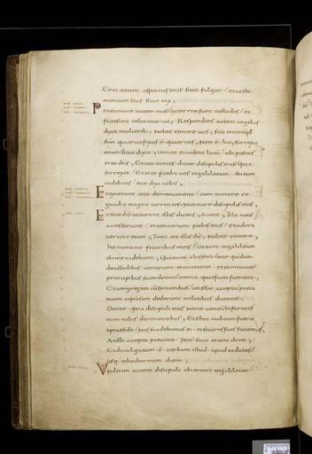 Keywords: MCC-61050 Evangeliarium (Lebuïnuscodex) (87).jpg Artwork nl Anonymous Noordoost-Frankrijk Anonymous Rijnland Anonymous Maasland nl De kern van de boekband van de Lebuïnuscodex wordt gevormd door twee eikenhouten platten De rug en het achterplat zijn overtrokken met zeemleer Het voorplat is rijkelijk versierd met verguld zilversmeedwerk reliëfs van walrustand en verscheidene stenen De compositie van de bekleding van het voorplat wordt bepaald door een verguld zilveren filigraankruis Aan de uiteinden van de kruisarmen bevinden zich vierpassen met overhoeks vierkant eveneens met filigraan gedecoreerd Hiervan zijn er slechts twee bewaard gebleven en wel die aan de verticale kruisarmen Zij bevatten tevens nog de oorspronkelijke versiering bestaande uit een filigraanmedaillon met een pseudo-camee van respectievelijk een mannen- en een vrouwenhoofd in profiel Het snijpunt van het kruis wordt ingenomen door een ver vooruitstekend Bacchuskopje in chalcedoon te herkennen aan de kleine druiventrosjes in zijn haartooi Het kopje is gevat in een filigraanmedaillon welke op zijn beurt weer is geplaatst op een vierpas van filigraanwerk Op elk van de kruisarmen bevindt zich een ovale steen 'en cabochon' op een medaillon met filigraan Het filigraanwerk van kruis en sierstukken is in de vorm van visblazen In de ruimten tussen de kruisarmen zijn rechthoekige reliëfs van walrustand aangebracht met de vier evangelisten en hun symbool De reliëfs hebben de volgende afmetingen H 10 0 x B 5 5 cm Van links boven naar rechts onder betreft het Mattheus met de engel Johannes met de adelaar Marcus met de gevleugelde leeuw en Lucas met de gevleugelde os De figuren zijn paarsgewijs als elkaars spiegelbeeld ten opzichte van de middenas geplaatst Mattheus en Johannes zitten vrijwel geheel frontaal terwijl Marcus en Lucas meer in profiel zijn afgebeeld Qua opbouw verschillen de vier reliëfs nauwelijks van elkaar Binnen een rand van vierlobbige blaadjes verheffen zich twee zuilen met een basis een kapiteel en een dekplaat Hierop rust een rondboog geflankeerd door twee torens en afgedekt met een fronton dat boven Mattheus en Johannes boogvormig en boven Marcus en Lucas driehoekig is Onder deze overhuiving zitten de evangelisten gekleed in een lang gewaad en mantel met gekruiste benen aan een lessenaar hun blote voeten rustend op een bankje Allen zijn baardeloos en voorzien van een nimbus Voorts houden ze een pen in hun rechterhand terwijl hun linker op een boek ligt of gebarend is opgeheven Boven elk van de evangelisten verschijnt in de opening van het fronton zijn symbool met een spreukband Dit rijkelijk gedecoreerde middenveld wordt omlijst door sierbanden van verguld koper De opbouw van de sierlijsten is steeds dezelfde een opstaande smalle band die op regelmatige afstanden is voorzien van holten met aan weerszijden een brede strook voorzien van een gestanst motief Aan de lange zijden van de boekband bestaat het motief uit palmetten aan de korte zijden uit rozetten Van deze laatstgenoemde stroken ontbreekt steeds de buitenste rand Bij alle stroken met palmettenmotief wijzen de palmetten naar links met uitzondering van de buitenste strook rechtsboven die het motief in tegengestelde richting toont Verguld zilveren rozetten op de hoeken van het voorplat omgeven door een smalle rand van filigraanwerk met cirkelmotief en bekroond met een 'en cabochon' gezette steen completeren het geheel Van de rozet links onder ontbreekt de steen en is slechts de buitenste rand over Aan de voorzijde van de boekband bevinden zich nog de rudimenten van twee sluitingen between u'825' u'1000' u'1150' u'850' u'1199' u'1199' nl perkament eikenhout zilver goud koper walrustand chalcedoon glas leer Size 35 5 26 0 cm nl Hoogte 35 5cm Breedte 26 0cm Diepte 13 5cm Institution Museum Catharijneconvent object history exhibition history credit line nl Foto Museum Catharijneconvent Utrecht foto HetFotoAtelier Peter Rothengatter accession number Object number 61050 Inventory number ABM h1 place of creation https //www catharijneconvent nl/adlib/61050/ View this work on the website of Museum Catharijneconvent Museum Catharijneconvent Cc-zero <gallery> File MCC-61050_Evangeliarium_Lebuïnuscodex_ 11 jpg File MCC-61050_Evangeliarium_Lebuïnuscodex_ 172 jpg File MCC-61050_Evangeliarium_Lebuïnuscodex_ 212 jpg File MCC-61050_Evangeliarium_Lebuïnuscodex_ 61 jpg File MCC-61050_Evangeliarium_Lebuïnuscodex_ 12 jpg File MCC-61050_Evangeliarium_Lebuïnuscodex_ 213 jpg File MCC-61050_Evangeliarium_Lebuïnuscodex_ 56 jpg File MCC-61050_Evangeliarium_Lebuïnuscodex_ 232 jpg File MCC-61050_Evangeliarium_Lebuïnuscodex_ 93 jpg File MCC-61050_Evangeliarium_Lebuïnuscodex_ 99 jpg File MCC-61050_Evangeliarium_Lebuïnuscodex_ 184 jpg File MCC-61050_Evangeliarium_Lebuïnuscodex_ 64 jpg File MCC-61050_Evangeliarium_Lebuïnuscodex_ 299 jpg File MCC-61050_Evangeliarium_Lebuïnuscodex_ 86 jpg File MCC-61050_Evangeliarium_Lebuïnuscodex_ 260 jpg File MCC-61050_Evangeliarium_Lebuïnuscodex_ 159 jpg File MCC-61050_Evangeliarium_Lebuïnuscodex_ 247 jpg File MCC-61050_Evangeliarium_Lebuïnuscodex_ 180 jpg File MCC-61050_Evangeliarium_Lebuïnuscodex_ 121 jpg File MCC-61050_Evangeliarium_Lebuïnuscodex_ 315 jpg File MCC-61050_Evangeliarium_Lebuïnuscodex_ 284 jpg File MCC-61050_Evangeliarium_Lebuïnuscodex_ 33 jpg File MCC-61050_Evangeliarium_Lebuïnuscodex_ 44 jpg File MCC-61050_Evangeliarium_Lebuïnuscodex_ 258 jpg File MCC-61050_Evangeliarium_Lebuïnuscodex_ 237 jpg File MCC-61050_Evangeliarium_Lebuïnuscodex_ 20 jpg File MCC-61050_Evangeliarium_Lebuïnuscodex_ 220 jpg File MCC-61050_Evangeliarium_Lebuïnuscodex_ 279 jpg File MCC-61050_Evangeliarium_Lebuïnuscodex_ 183 jpg File MCC-61050_Evangeliarium_Lebuïnuscodex_ 60 jpg File MCC-61050_Evangeliarium_Lebuïnuscodex_ 166 jpg File MCC-61050_Evangeliarium_Lebuïnuscodex_ 97 jpg File MCC-61050_Evangeliarium_Lebuïnuscodex_ 71 jpg File MCC-61050_Evangeliarium_Lebuïnuscodex_ 132 jpg File MCC-61050_Evangeliarium_Lebuïnusc