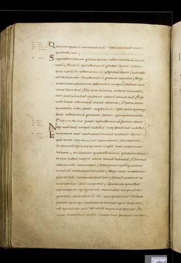 Keywords: MCC-61050 Evangeliarium (Lebuïnuscodex) (238).jpg Artwork nl Anonymous Noordoost-Frankrijk Anonymous Rijnland Anonymous Maasland nl De kern van de boekband van de Lebuïnuscodex wordt gevormd door twee eikenhouten platten De rug en het achterplat zijn overtrokken met zeemleer Het voorplat is rijkelijk versierd met verguld zilversmeedwerk reliëfs van walrustand en verscheidene stenen De compositie van de bekleding van het voorplat wordt bepaald door een verguld zilveren filigraankruis Aan de uiteinden van de kruisarmen bevinden zich vierpassen met overhoeks vierkant eveneens met filigraan gedecoreerd Hiervan zijn er slechts twee bewaard gebleven en wel die aan de verticale kruisarmen Zij bevatten tevens nog de oorspronkelijke versiering bestaande uit een filigraanmedaillon met een pseudo-camee van respectievelijk een mannen- en een vrouwenhoofd in profiel Het snijpunt van het kruis wordt ingenomen door een ver vooruitstekend Bacchuskopje in chalcedoon te herkennen aan de kleine druiventrosjes in zijn haartooi Het kopje is gevat in een filigraanmedaillon welke op zijn beurt weer is geplaatst op een vierpas van filigraanwerk Op elk van de kruisarmen bevindt zich een ovale steen 'en cabochon' op een medaillon met filigraan Het filigraanwerk van kruis en sierstukken is in de vorm van visblazen In de ruimten tussen de kruisarmen zijn rechthoekige reliëfs van walrustand aangebracht met de vier evangelisten en hun symbool De reliëfs hebben de volgende afmetingen H 10 0 x B 5 5 cm Van links boven naar rechts onder betreft het Mattheus met de engel Johannes met de adelaar Marcus met de gevleugelde leeuw en Lucas met de gevleugelde os De figuren zijn paarsgewijs als elkaars spiegelbeeld ten opzichte van de middenas geplaatst Mattheus en Johannes zitten vrijwel geheel frontaal terwijl Marcus en Lucas meer in profiel zijn afgebeeld Qua opbouw verschillen de vier reliëfs nauwelijks van elkaar Binnen een rand van vierlobbige blaadjes verheffen zich twee zuilen met een basis een kapiteel en een dekplaat Hierop rust een rondboog geflankeerd door twee torens en afgedekt met een fronton dat boven Mattheus en Johannes boogvormig en boven Marcus en Lucas driehoekig is Onder deze overhuiving zitten de evangelisten gekleed in een lang gewaad en mantel met gekruiste benen aan een lessenaar hun blote voeten rustend op een bankje Allen zijn baardeloos en voorzien van een nimbus Voorts houden ze een pen in hun rechterhand terwijl hun linker op een boek ligt of gebarend is opgeheven Boven elk van de evangelisten verschijnt in de opening van het fronton zijn symbool met een spreukband Dit rijkelijk gedecoreerde middenveld wordt omlijst door sierbanden van verguld koper De opbouw van de sierlijsten is steeds dezelfde een opstaande smalle band die op regelmatige afstanden is voorzien van holten met aan weerszijden een brede strook voorzien van een gestanst motief Aan de lange zijden van de boekband bestaat het motief uit palmetten aan de korte zijden uit rozetten Van deze laatstgenoemde stroken ontbreekt steeds de buitenste rand Bij alle stroken met palmettenmotief wijzen de palmetten naar links met uitzondering van de buitenste strook rechtsboven die het motief in tegengestelde richting toont Verguld zilveren rozetten op de hoeken van het voorplat omgeven door een smalle rand van filigraanwerk met cirkelmotief en bekroond met een 'en cabochon' gezette steen completeren het geheel Van de rozet links onder ontbreekt de steen en is slechts de buitenste rand over Aan de voorzijde van de boekband bevinden zich nog de rudimenten van twee sluitingen between u'825' u'1000' u'1150' u'850' u'1199' u'1199' nl perkament eikenhout zilver goud koper walrustand chalcedoon glas leer Size 35 5 26 0 cm nl Hoogte 35 5cm Breedte 26 0cm Diepte 13 5cm Institution Museum Catharijneconvent object history exhibition history credit line nl Foto Museum Catharijneconvent Utrecht foto HetFotoAtelier Peter Rothengatter accession number Object number 61050 Inventory number ABM h1 place of creation https //www catharijneconvent nl/adlib/61050/ View this work on the website of Museum Catharijneconvent Museum Catharijneconvent Cc-zero <gallery> File MCC-61050_Evangeliarium_Lebuïnuscodex_ 11 jpg File MCC-61050_Evangeliarium_Lebuïnuscodex_ 172 jpg File MCC-61050_Evangeliarium_Lebuïnuscodex_ 212 jpg File MCC-61050_Evangeliarium_Lebuïnuscodex_ 61 jpg File MCC-61050_Evangeliarium_Lebuïnuscodex_ 12 jpg File MCC-61050_Evangeliarium_Lebuïnuscodex_ 213 jpg File MCC-61050_Evangeliarium_Lebuïnuscodex_ 56 jpg File MCC-61050_Evangeliarium_Lebuïnuscodex_ 232 jpg File MCC-61050_Evangeliarium_Lebuïnuscodex_ 93 jpg File MCC-61050_Evangeliarium_Lebuïnuscodex_ 99 jpg File MCC-61050_Evangeliarium_Lebuïnuscodex_ 184 jpg File MCC-61050_Evangeliarium_Lebuïnuscodex_ 64 jpg File MCC-61050_Evangeliarium_Lebuïnuscodex_ 299 jpg File MCC-61050_Evangeliarium_Lebuïnuscodex_ 86 jpg File MCC-61050_Evangeliarium_Lebuïnuscodex_ 260 jpg File MCC-61050_Evangeliarium_Lebuïnuscodex_ 159 jpg File MCC-61050_Evangeliarium_Lebuïnuscodex_ 247 jpg File MCC-61050_Evangeliarium_Lebuïnuscodex_ 180 jpg File MCC-61050_Evangeliarium_Lebuïnuscodex_ 121 jpg File MCC-61050_Evangeliarium_Lebuïnuscodex_ 315 jpg File MCC-61050_Evangeliarium_Lebuïnuscodex_ 284 jpg File MCC-61050_Evangeliarium_Lebuïnuscodex_ 33 jpg File MCC-61050_Evangeliarium_Lebuïnuscodex_ 44 jpg File MCC-61050_Evangeliarium_Lebuïnuscodex_ 258 jpg File MCC-61050_Evangeliarium_Lebuïnuscodex_ 237 jpg File MCC-61050_Evangeliarium_Lebuïnuscodex_ 20 jpg File MCC-61050_Evangeliarium_Lebuïnuscodex_ 220 jpg File MCC-61050_Evangeliarium_Lebuïnuscodex_ 279 jpg File MCC-61050_Evangeliarium_Lebuïnuscodex_ 183 jpg File MCC-61050_Evangeliarium_Lebuïnuscodex_ 60 jpg File MCC-61050_Evangeliarium_Lebuïnuscodex_ 166 jpg File MCC-61050_Evangeliarium_Lebuïnuscodex_ 97 jpg File MCC-61050_Evangeliarium_Lebuïnuscodex_ 71 jpg File MCC-61050_Evangeliarium_Lebuïnuscodex_ 132 jpg File MCC-61050_Evangeliarium_Lebuïnus