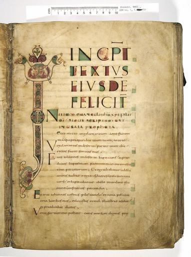 Keywords: MCC-61050 Evangeliarium (Lebuïnuscodex) (93).jpg Artwork nl Anonymous Noordoost-Frankrijk Anonymous Rijnland Anonymous Maasland nl De kern van de boekband van de Lebuïnuscodex wordt gevormd door twee eikenhouten platten De rug en het achterplat zijn overtrokken met zeemleer Het voorplat is rijkelijk versierd met verguld zilversmeedwerk reliëfs van walrustand en verscheidene stenen De compositie van de bekleding van het voorplat wordt bepaald door een verguld zilveren filigraankruis Aan de uiteinden van de kruisarmen bevinden zich vierpassen met overhoeks vierkant eveneens met filigraan gedecoreerd Hiervan zijn er slechts twee bewaard gebleven en wel die aan de verticale kruisarmen Zij bevatten tevens nog de oorspronkelijke versiering bestaande uit een filigraanmedaillon met een pseudo-camee van respectievelijk een mannen- en een vrouwenhoofd in profiel Het snijpunt van het kruis wordt ingenomen door een ver vooruitstekend Bacchuskopje in chalcedoon te herkennen aan de kleine druiventrosjes in zijn haartooi Het kopje is gevat in een filigraanmedaillon welke op zijn beurt weer is geplaatst op een vierpas van filigraanwerk Op elk van de kruisarmen bevindt zich een ovale steen 'en cabochon' op een medaillon met filigraan Het filigraanwerk van kruis en sierstukken is in de vorm van visblazen In de ruimten tussen de kruisarmen zijn rechthoekige reliëfs van walrustand aangebracht met de vier evangelisten en hun symbool De reliëfs hebben de volgende afmetingen H 10 0 x B 5 5 cm Van links boven naar rechts onder betreft het Mattheus met de engel Johannes met de adelaar Marcus met de gevleugelde leeuw en Lucas met de gevleugelde os De figuren zijn paarsgewijs als elkaars spiegelbeeld ten opzichte van de middenas geplaatst Mattheus en Johannes zitten vrijwel geheel frontaal terwijl Marcus en Lucas meer in profiel zijn afgebeeld Qua opbouw verschillen de vier reliëfs nauwelijks van elkaar Binnen een rand van vierlobbige blaadjes verheffen zich twee zuilen met een basis een kapiteel en een dekplaat Hierop rust een rondboog geflankeerd door twee torens en afgedekt met een fronton dat boven Mattheus en Johannes boogvormig en boven Marcus en Lucas driehoekig is Onder deze overhuiving zitten de evangelisten gekleed in een lang gewaad en mantel met gekruiste benen aan een lessenaar hun blote voeten rustend op een bankje Allen zijn baardeloos en voorzien van een nimbus Voorts houden ze een pen in hun rechterhand terwijl hun linker op een boek ligt of gebarend is opgeheven Boven elk van de evangelisten verschijnt in de opening van het fronton zijn symbool met een spreukband Dit rijkelijk gedecoreerde middenveld wordt omlijst door sierbanden van verguld koper De opbouw van de sierlijsten is steeds dezelfde een opstaande smalle band die op regelmatige afstanden is voorzien van holten met aan weerszijden een brede strook voorzien van een gestanst motief Aan de lange zijden van de boekband bestaat het motief uit palmetten aan de korte zijden uit rozetten Van deze laatstgenoemde stroken ontbreekt steeds de buitenste rand Bij alle stroken met palmettenmotief wijzen de palmetten naar links met uitzondering van de buitenste strook rechtsboven die het motief in tegengestelde richting toont Verguld zilveren rozetten op de hoeken van het voorplat omgeven door een smalle rand van filigraanwerk met cirkelmotief en bekroond met een 'en cabochon' gezette steen completeren het geheel Van de rozet links onder ontbreekt de steen en is slechts de buitenste rand over Aan de voorzijde van de boekband bevinden zich nog de rudimenten van twee sluitingen between u'825' u'1000' u'1150' u'850' u'1199' u'1199' nl perkament eikenhout zilver goud koper walrustand chalcedoon glas leer Size 35 5 26 0 cm nl Hoogte 35 5cm Breedte 26 0cm Diepte 13 5cm Institution Museum Catharijneconvent object history exhibition history credit line nl Foto Museum Catharijneconvent Utrecht foto HetFotoAtelier Peter Rothengatter Reproduction title nl Begin van het evangelie van Marcus accession number Object number 61050 Inventory number ABM h1 place of creation https //www catharijneconvent nl/adlib/61050/ View this work on the website of Museum Catharijneconvent Museum Catharijneconvent Cc-zero <gallery> File MCC-61050_Evangeliarium_Lebuïnuscodex_ 11 jpg File MCC-61050_Evangeliarium_Lebuïnuscodex_ 172 jpg File MCC-61050_Evangeliarium_Lebuïnuscodex_ 212 jpg File MCC-61050_Evangeliarium_Lebuïnuscodex_ 61 jpg File MCC-61050_Evangeliarium_Lebuïnuscodex_ 12 jpg File MCC-61050_Evangeliarium_Lebuïnuscodex_ 213 jpg File MCC-61050_Evangeliarium_Lebuïnuscodex_ 56 jpg File MCC-61050_Evangeliarium_Lebuïnuscodex_ 232 jpg File MCC-61050_Evangeliarium_Lebuïnuscodex_ 93 jpg File MCC-61050_Evangeliarium_Lebuïnuscodex_ 99 jpg File MCC-61050_Evangeliarium_Lebuïnuscodex_ 184 jpg File MCC-61050_Evangeliarium_Lebuïnuscodex_ 64 jpg File MCC-61050_Evangeliarium_Lebuïnuscodex_ 299 jpg File MCC-61050_Evangeliarium_Lebuïnuscodex_ 86 jpg File MCC-61050_Evangeliarium_Lebuïnuscodex_ 260 jpg File MCC-61050_Evangeliarium_Lebuïnuscodex_ 159 jpg File MCC-61050_Evangeliarium_Lebuïnuscodex_ 247 jpg File MCC-61050_Evangeliarium_Lebuïnuscodex_ 180 jpg File MCC-61050_Evangeliarium_Lebuïnuscodex_ 121 jpg File MCC-61050_Evangeliarium_Lebuïnuscodex_ 315 jpg File MCC-61050_Evangeliarium_Lebuïnuscodex_ 284 jpg File MCC-61050_Evangeliarium_Lebuïnuscodex_ 33 jpg File MCC-61050_Evangeliarium_Lebuïnuscodex_ 44 jpg File MCC-61050_Evangeliarium_Lebuïnuscodex_ 258 jpg File MCC-61050_Evangeliarium_Lebuïnuscodex_ 237 jpg File MCC-61050_Evangeliarium_Lebuïnuscodex_ 20 jpg File MCC-61050_Evangeliarium_Lebuïnuscodex_ 220 jpg File MCC-61050_Evangeliarium_Lebuïnuscodex_ 279 jpg File MCC-61050_Evangeliarium_Lebuïnuscodex_ 183 jpg File MCC-61050_Evangeliarium_Lebuïnuscodex_ 60 jpg File MCC-61050_Evangeliarium_Lebuïnuscodex_ 166 jpg File MCC-61050_Evangeliarium_Lebuïnuscodex_ 97 jpg File MCC-61050_Evangeliarium_Lebuïnuscodex_ 71 jpg File MCC-61050_Evangeliarium_Lebuï