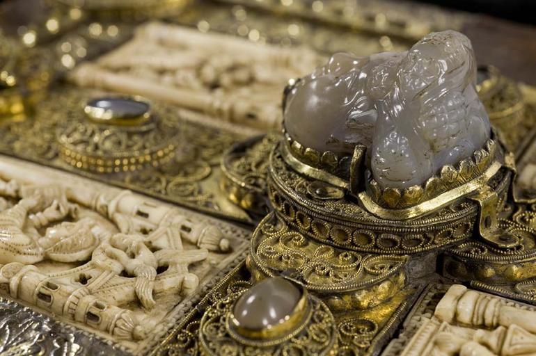 Keywords: MCC-61050 Evangeliarium (Lebuïnuscodex) (319).jpg Artwork nl Anonymous Noordoost-Frankrijk Anonymous Rijnland Anonymous Maasland nl De kern van de boekband van de Lebuïnuscodex wordt gevormd door twee eikenhouten platten De rug en het achterplat zijn overtrokken met zeemleer Het voorplat is rijkelijk versierd met verguld zilversmeedwerk reliëfs van walrustand en verscheidene stenen De compositie van de bekleding van het voorplat wordt bepaald door een verguld zilveren filigraankruis Aan de uiteinden van de kruisarmen bevinden zich vierpassen met overhoeks vierkant eveneens met filigraan gedecoreerd Hiervan zijn er slechts twee bewaard gebleven en wel die aan de verticale kruisarmen Zij bevatten tevens nog de oorspronkelijke versiering bestaande uit een filigraanmedaillon met een pseudo-camee van respectievelijk een mannen- en een vrouwenhoofd in profiel Het snijpunt van het kruis wordt ingenomen door een ver vooruitstekend Bacchuskopje in chalcedoon te herkennen aan de kleine druiventrosjes in zijn haartooi Het kopje is gevat in een filigraanmedaillon welke op zijn beurt weer is geplaatst op een vierpas van filigraanwerk Op elk van de kruisarmen bevindt zich een ovale steen 'en cabochon' op een medaillon met filigraan Het filigraanwerk van kruis en sierstukken is in de vorm van visblazen In de ruimten tussen de kruisarmen zijn rechthoekige reliëfs van walrustand aangebracht met de vier evangelisten en hun symbool De reliëfs hebben de volgende afmetingen H 10 0 x B 5 5 cm Van links boven naar rechts onder betreft het Mattheus met de engel Johannes met de adelaar Marcus met de gevleugelde leeuw en Lucas met de gevleugelde os De figuren zijn paarsgewijs als elkaars spiegelbeeld ten opzichte van de middenas geplaatst Mattheus en Johannes zitten vrijwel geheel frontaal terwijl Marcus en Lucas meer in profiel zijn afgebeeld Qua opbouw verschillen de vier reliëfs nauwelijks van elkaar Binnen een rand van vierlobbige blaadjes verheffen zich twee zuilen met een basis een kapiteel en een dekplaat Hierop rust een rondboog geflankeerd door twee torens en afgedekt met een fronton dat boven Mattheus en Johannes boogvormig en boven Marcus en Lucas driehoekig is Onder deze overhuiving zitten de evangelisten gekleed in een lang gewaad en mantel met gekruiste benen aan een lessenaar hun blote voeten rustend op een bankje Allen zijn baardeloos en voorzien van een nimbus Voorts houden ze een pen in hun rechterhand terwijl hun linker op een boek ligt of gebarend is opgeheven Boven elk van de evangelisten verschijnt in de opening van het fronton zijn symbool met een spreukband Dit rijkelijk gedecoreerde middenveld wordt omlijst door sierbanden van verguld koper De opbouw van de sierlijsten is steeds dezelfde een opstaande smalle band die op regelmatige afstanden is voorzien van holten met aan weerszijden een brede strook voorzien van een gestanst motief Aan de lange zijden van de boekband bestaat het motief uit palmetten aan de korte zijden uit rozetten Van deze laatstgenoemde stroken ontbreekt steeds de buitenste rand Bij alle stroken met palmettenmotief wijzen de palmetten naar links met uitzondering van de buitenste strook rechtsboven die het motief in tegengestelde richting toont Verguld zilveren rozetten op de hoeken van het voorplat omgeven door een smalle rand van filigraanwerk met cirkelmotief en bekroond met een 'en cabochon' gezette steen completeren het geheel Van de rozet links onder ontbreekt de steen en is slechts de buitenste rand over Aan de voorzijde van de boekband bevinden zich nog de rudimenten van twee sluitingen between u'825' u'1000' u'1150' u'850' u'1199' u'1199' nl perkament eikenhout zilver goud koper walrustand chalcedoon glas leer Size 35 5 26 0 cm nl Hoogte 35 5cm Breedte 26 0cm Diepte 13 5cm Institution Museum Catharijneconvent object history exhibition history credit line nl Foto Museum Catharijneconvent Utrecht foto HetFotoAtelier Peter Rothengatter accession number Object number 61050 Inventory number ABM h1 place of creation https //www catharijneconvent nl/adlib/61050/ View this work on the website of Museum Catharijneconvent Museum Catharijneconvent Cc-zero <gallery> File MCC-61050_Evangeliarium_Lebuïnuscodex_ 11 jpg File MCC-61050_Evangeliarium_Lebuïnuscodex_ 172 jpg File MCC-61050_Evangeliarium_Lebuïnuscodex_ 212 jpg File MCC-61050_Evangeliarium_Lebuïnuscodex_ 61 jpg File MCC-61050_Evangeliarium_Lebuïnuscodex_ 12 jpg File MCC-61050_Evangeliarium_Lebuïnuscodex_ 213 jpg File MCC-61050_Evangeliarium_Lebuïnuscodex_ 56 jpg File MCC-61050_Evangeliarium_Lebuïnuscodex_ 232 jpg File MCC-61050_Evangeliarium_Lebuïnuscodex_ 93 jpg File MCC-61050_Evangeliarium_Lebuïnuscodex_ 99 jpg File MCC-61050_Evangeliarium_Lebuïnuscodex_ 184 jpg File MCC-61050_Evangeliarium_Lebuïnuscodex_ 64 jpg File MCC-61050_Evangeliarium_Lebuïnuscodex_ 299 jpg File MCC-61050_Evangeliarium_Lebuïnuscodex_ 86 jpg File MCC-61050_Evangeliarium_Lebuïnuscodex_ 260 jpg File MCC-61050_Evangeliarium_Lebuïnuscodex_ 159 jpg File MCC-61050_Evangeliarium_Lebuïnuscodex_ 247 jpg File MCC-61050_Evangeliarium_Lebuïnuscodex_ 180 jpg File MCC-61050_Evangeliarium_Lebuïnuscodex_ 121 jpg File MCC-61050_Evangeliarium_Lebuïnuscodex_ 315 jpg File MCC-61050_Evangeliarium_Lebuïnuscodex_ 284 jpg File MCC-61050_Evangeliarium_Lebuïnuscodex_ 33 jpg File MCC-61050_Evangeliarium_Lebuïnuscodex_ 44 jpg File MCC-61050_Evangeliarium_Lebuïnuscodex_ 258 jpg File MCC-61050_Evangeliarium_Lebuïnuscodex_ 237 jpg File MCC-61050_Evangeliarium_Lebuïnuscodex_ 20 jpg File MCC-61050_Evangeliarium_Lebuïnuscodex_ 220 jpg File MCC-61050_Evangeliarium_Lebuïnuscodex_ 279 jpg File MCC-61050_Evangeliarium_Lebuïnuscodex_ 183 jpg File MCC-61050_Evangeliarium_Lebuïnuscodex_ 60 jpg File MCC-61050_Evangeliarium_Lebuïnuscodex_ 166 jpg File MCC-61050_Evangeliarium_Lebuïnuscodex_ 97 jpg File MCC-61050_Evangeliarium_Lebuïnuscodex_ 71 jpg File MCC-61050_Evangeliarium_Lebuïnuscodex_ 132 jpg File MCC-61050_Evangeliarium_Lebuïnus