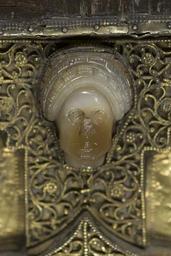 Keywords: MCC-68515 Evangelistarium (Bernulphuscodex) (6).jpg Artwork nl Anonymous Zuid-Duitsland Reichenau OSB nl De kern van de boekband van de Bernulphuscodex wordt gevormd door twee eikenhouten platten De rug en het achterplat zijn overtrokken met zeemleer Het voorplat bestaat uit een enigszins verdiept rechthoekig middenveld omgeven door een brede rand In het middenveld bevindt zich een verguld zilveren filigraankruis met een verhoogd ingezwenkt achtkantig middenstuk en breed uitlopende armen Het filigraanwerk bestaat uit cirkelvormige uitwaaierende ranken met bolletjes aan de uiteinden en in het midden hier en daar kleine rozetjes Op het snijpunt van beide kruisarmen bevindt zich een ovale zwartblauw en grijs gekleurde onyx in de bovenarm een klassiek gesneden vrouwenkop van chalcedoon op de rechterarm een stuk donkerrood glas en beneden een bruin gestreepte agaat De bekleding van de linker kruisarm ontbreekt De lager gelegen velden tussen de kruisarmen zijn bekleed met dunne gouden platen Langs de randen hiervan is een parelrandje gestanst In het midden van de velden bevindt zich een medaillon met email-cloisonné De bovenste twee zijn voorzien van een diagonaal patroon met witte getrapte vierkantjes met rode stip tegen een donkerblauwe achtergrond Op de onderste twee is een stervormig respectievelijk concentrisch patroon aangebracht De aldaar toegepaste kleuren zijn translucide groen opaak wit geel en bruinpaars In de buitenste hoeken van de lager gelegen velden zijn ronde stenen in een vierkante zetting aangebracht Hiervan is slechts de opaal in de rechter bovenhoek bewaard gebleven In de overige hoeken is alleen nog de vierkante uitsparing te zien De brede rand is overtrokken met verguld zilveren stroken met grote rozetten die van elkaar gescheiden zijn door vier kleine stippelroosjes tussen twee evenwijdig lopende parelrandjes Aan de korte zijden van het voorplat ontbreekt de rozettenrand; slechts de spijkers waarmee ze waren vastgemaakt zijn nog te zien Aan de lange zijde ontbreekt een stuk uit de rand en wel links onder het midden Verdeeld over de nog aanwezige rozetten zijn vier alsengemmen en twee zilveren medaillons aangebracht Laatstgenoemde zijn versierd met een gezicht en bladwerk Vier medaillons met de evangelistensymbolen zijn op de hoeken van de brede rand aangebracht van links boven naar rechts onder betreft het de adelaar van Johannes de engel van Mattheus de gevleugelde os van Lucas en de gevleugelde leeuw van Marcus De banderol die de figuren dragen vermeldt de naam van de betreffende evangelist De naam van Marcus staat in spiegelbeeld Het woord Lucas is over andere letters gekrast De armen van het kruis de acht segmenten van het middenstuk alsmede de sierstukken zijn omlijst met een fijn geparelde gouden filigraandraad Techniek nog in te vullen volgens Korteweg zijn de medaillons met symbolen van Marcus en Lucas uit een graveerplaat gezaagd; rozetten in rand gestanst De sierlijst met rozetten is met behulp van kleine spijkertjes op de houten rand bevestigd Staat nog in te vullen Volgens Korteweg 1979 waren de medaillons met de symbolen van Johannes en Mattheus oorspronkelijk geëmailleerd De velden vertonen nog sporen van gekleurd email Volgens Steenbock 1965 waren het juist de medaillons met Lucas en Marcus Volgens Korteweg 1979 is het verguldsel van de stroken met rozetten enigszins afgesleten Onder de linkerzijde van het metaalwerk van het voorplat bevindt zich rode zijde; aan de smalle zijden van het voorplat ontbreken de rozettenranden slechts de spijkers waarmee ze waren vastgemaakt zijn nog te zien Aan de lange zijde links onder het midden ontbreekt een stuk uit de rand Van het chalcedonen vrouwenkopje ontbreekt de neus en is de kin beschadigd between u'1040' u'1200' u'1050' u'1499' nl perkament eikenhout zilver goud chalcedoon onyx glas agaat opaal Size 31 5 24 0 cm nl Hoogte 31 5cm Breedte 24 0cm Diepte 9 8cm Institution Museum Catharijneconvent object history exhibition history credit line nl Foto Museum Catharijneconvent Utrecht foto HetFotoAtelier Peter Rothengatter Reproduction title nl Boekband voorzijde detail accession number Object number 68515 Inventory number ABM h3 place of creation https //www catharijneconvent nl/adlib/68515/ View this work on the website of Museum Catharijneconvent Museum Catharijneconvent Cc-zero <gallery> File MCC-68515_Evangelistarium_Bernulphuscodex_ 353 jpg File MCC-68515_Evangelistarium_Bernulphuscodex_ 412 jpg File MCC-68515_Evangelistarium_Bernulphuscodex_ 160 jpg File MCC-68515_Evangelistarium_Bernulphuscodex_ 6 jpg File MCC-68515_Evangelistarium_Bernulphuscodex_ 393 jpg File MCC-68515_Evangelistarium_Bernulphuscodex_ 89 jpg File MCC-68515_Evangelistarium_Bernulphuscodex_ 270 jpg File MCC-68515_Evangelistarium_Bernulphuscodex_ 425 jpg File MCC-68515_Evangelistarium_Bernulphuscodex_ 104 jpg File MCC-68515_Evangelistarium_Bernulphuscodex_ 291 jpg File MCC-68515_Evangelistarium_Bernulphuscodex_ 398 jpg File MCC-68515_Evangelistarium_Bernulphuscodex_ 339 jpg File MCC-68515_Evangelistarium_Bernulphuscodex_ 65 jpg File MCC-68515_Evangelistarium_Bernulphuscodex_ 403 jpg File MCC-68515_Evangelistarium_Bernulphuscodex_ 311 jpg File MCC-68515_Evangelistarium_Bernulphuscodex_ 159 jpg File MCC-68515_Evangelistarium_Bernulphuscodex_ 347 jpg File MCC-68515_Evangelistarium_Bernulphuscodex_ 453 jpg File MCC-68515_Evangelistarium_Bernulphuscodex_ 289 jpg File MCC-68515_Evangelistarium_Bernulphuscodex_ 273 jpg File MCC-68515_Evangelistarium_Bernulphuscodex_ 286 jpg File MCC-68515_Evangelistarium_Bernulphuscodex_ 236 jpg File MCC-68515_Evangelistarium_Bernulphuscodex_ 447 jpg File MCC-68515_Evangelistarium_Bernulphuscodex_ 227 jpg File MCC-68515_Evangelistarium_Bernulphuscodex_ 110 jpg File MCC-68515_Evangelistarium_Bernulphuscodex_ 139 jpg File MCC-68515_Evangelistarium_Bernulphuscodex_ 276 jpg File MCC-68515_Evangelistarium_Bernulphuscodex_ 10 jpg File MCC-68515_Evangelistarium_Bernulphuscodex_ 325 jpg File MCC-68515_Evangelistar