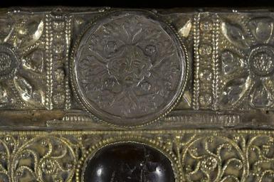 Keywords: MCC-68515 Evangelistarium (Bernulphuscodex) (10).jpg Artwork nl Anonymous Zuid-Duitsland Reichenau OSB nl De kern van de boekband van de Bernulphuscodex wordt gevormd door twee eikenhouten platten De rug en het achterplat zijn overtrokken met zeemleer Het voorplat bestaat uit een enigszins verdiept rechthoekig middenveld omgeven door een brede rand In het middenveld bevindt zich een verguld zilveren filigraankruis met een verhoogd ingezwenkt achtkantig middenstuk en breed uitlopende armen Het filigraanwerk bestaat uit cirkelvormige uitwaaierende ranken met bolletjes aan de uiteinden en in het midden hier en daar kleine rozetjes Op het snijpunt van beide kruisarmen bevindt zich een ovale zwartblauw en grijs gekleurde onyx in de bovenarm een klassiek gesneden vrouwenkop van chalcedoon op de rechterarm een stuk donkerrood glas en beneden een bruin gestreepte agaat De bekleding van de linker kruisarm ontbreekt De lager gelegen velden tussen de kruisarmen zijn bekleed met dunne gouden platen Langs de randen hiervan is een parelrandje gestanst In het midden van de velden bevindt zich een medaillon met email-cloisonné De bovenste twee zijn voorzien van een diagonaal patroon met witte getrapte vierkantjes met rode stip tegen een donkerblauwe achtergrond Op de onderste twee is een stervormig respectievelijk concentrisch patroon aangebracht De aldaar toegepaste kleuren zijn translucide groen opaak wit geel en bruinpaars In de buitenste hoeken van de lager gelegen velden zijn ronde stenen in een vierkante zetting aangebracht Hiervan is slechts de opaal in de rechter bovenhoek bewaard gebleven In de overige hoeken is alleen nog de vierkante uitsparing te zien De brede rand is overtrokken met verguld zilveren stroken met grote rozetten die van elkaar gescheiden zijn door vier kleine stippelroosjes tussen twee evenwijdig lopende parelrandjes Aan de korte zijden van het voorplat ontbreekt de rozettenrand; slechts de spijkers waarmee ze waren vastgemaakt zijn nog te zien Aan de lange zijde ontbreekt een stuk uit de rand en wel links onder het midden Verdeeld over de nog aanwezige rozetten zijn vier alsengemmen en twee zilveren medaillons aangebracht Laatstgenoemde zijn versierd met een gezicht en bladwerk Vier medaillons met de evangelistensymbolen zijn op de hoeken van de brede rand aangebracht van links boven naar rechts onder betreft het de adelaar van Johannes de engel van Mattheus de gevleugelde os van Lucas en de gevleugelde leeuw van Marcus De banderol die de figuren dragen vermeldt de naam van de betreffende evangelist De naam van Marcus staat in spiegelbeeld Het woord Lucas is over andere letters gekrast De armen van het kruis de acht segmenten van het middenstuk alsmede de sierstukken zijn omlijst met een fijn geparelde gouden filigraandraad Techniek nog in te vullen volgens Korteweg zijn de medaillons met symbolen van Marcus en Lucas uit een graveerplaat gezaagd; rozetten in rand gestanst De sierlijst met rozetten is met behulp van kleine spijkertjes op de houten rand bevestigd Staat nog in te vullen Volgens Korteweg 1979 waren de medaillons met de symbolen van Johannes en Mattheus oorspronkelijk geëmailleerd De velden vertonen nog sporen van gekleurd email Volgens Steenbock 1965 waren het juist de medaillons met Lucas en Marcus Volgens Korteweg 1979 is het verguldsel van de stroken met rozetten enigszins afgesleten Onder de linkerzijde van het metaalwerk van het voorplat bevindt zich rode zijde; aan de smalle zijden van het voorplat ontbreken de rozettenranden slechts de spijkers waarmee ze waren vastgemaakt zijn nog te zien Aan de lange zijde links onder het midden ontbreekt een stuk uit de rand Van het chalcedonen vrouwenkopje ontbreekt de neus en is de kin beschadigd between u'1040' u'1200' u'1050' u'1499' nl perkament eikenhout zilver goud chalcedoon onyx glas agaat opaal Size 31 5 24 0 cm nl Hoogte 31 5cm Breedte 24 0cm Diepte 9 8cm Institution Museum Catharijneconvent object history exhibition history credit line nl Foto Museum Catharijneconvent Utrecht foto HetFotoAtelier Peter Rothengatter Reproduction title nl Boekband voorzijde detail accession number Object number 68515 Inventory number ABM h3 place of creation https //www catharijneconvent nl/adlib/68515/ View this work on the website of Museum Catharijneconvent Museum Catharijneconvent Cc-zero <gallery> File MCC-68515_Evangelistarium_Bernulphuscodex_ 353 jpg File MCC-68515_Evangelistarium_Bernulphuscodex_ 412 jpg File MCC-68515_Evangelistarium_Bernulphuscodex_ 160 jpg File MCC-68515_Evangelistarium_Bernulphuscodex_ 6 jpg File MCC-68515_Evangelistarium_Bernulphuscodex_ 393 jpg File MCC-68515_Evangelistarium_Bernulphuscodex_ 89 jpg File MCC-68515_Evangelistarium_Bernulphuscodex_ 270 jpg File MCC-68515_Evangelistarium_Bernulphuscodex_ 425 jpg File MCC-68515_Evangelistarium_Bernulphuscodex_ 104 jpg File MCC-68515_Evangelistarium_Bernulphuscodex_ 291 jpg File MCC-68515_Evangelistarium_Bernulphuscodex_ 398 jpg File MCC-68515_Evangelistarium_Bernulphuscodex_ 339 jpg File MCC-68515_Evangelistarium_Bernulphuscodex_ 65 jpg File MCC-68515_Evangelistarium_Bernulphuscodex_ 403 jpg File MCC-68515_Evangelistarium_Bernulphuscodex_ 311 jpg File MCC-68515_Evangelistarium_Bernulphuscodex_ 159 jpg File MCC-68515_Evangelistarium_Bernulphuscodex_ 347 jpg File MCC-68515_Evangelistarium_Bernulphuscodex_ 453 jpg File MCC-68515_Evangelistarium_Bernulphuscodex_ 289 jpg File MCC-68515_Evangelistarium_Bernulphuscodex_ 273 jpg File MCC-68515_Evangelistarium_Bernulphuscodex_ 286 jpg File MCC-68515_Evangelistarium_Bernulphuscodex_ 236 jpg File MCC-68515_Evangelistarium_Bernulphuscodex_ 447 jpg File MCC-68515_Evangelistarium_Bernulphuscodex_ 227 jpg File MCC-68515_Evangelistarium_Bernulphuscodex_ 110 jpg File MCC-68515_Evangelistarium_Bernulphuscodex_ 139 jpg File MCC-68515_Evangelistarium_Bernulphuscodex_ 276 jpg File MCC-68515_Evangelistarium_Bernulphuscodex_ 10 jpg File MCC-68515_Evangelistarium_Bernulphuscodex_ 325 jpg File MCC-68515_Evangelista