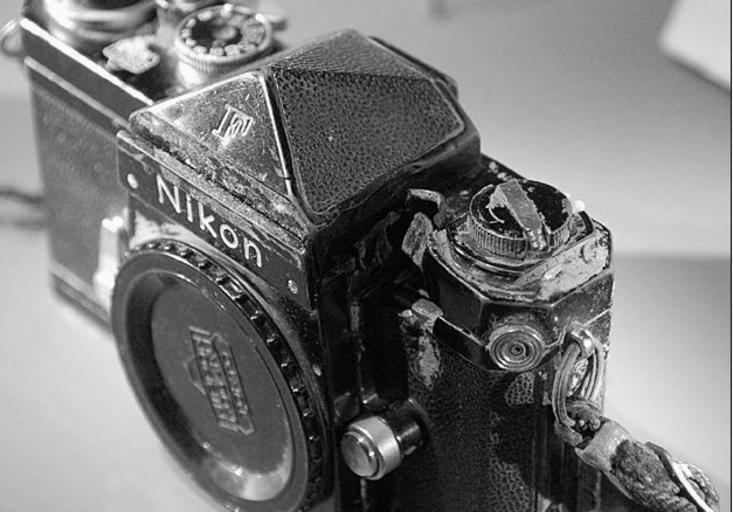 | Keywords: McCullin si trovava ad attraversare un fiume in Viet-Nam. Aveva legato la sua Nikon F sull'elmetto che teneva in testa per evitare che si bagnasse. Mentre attraversava il fiume un proiettile colpì la Nikon, che lo deviò. La Nikon F funziona ancora. |