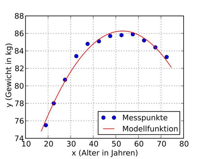 Keywords: MDKQ3.svg de Fit einer parabolischen Funktion own Neufassung und Zusammenfassung von File Scatterplot1 png und File AlterGewicht png vom Benutzer Philipendula Christian Schirm 2011-02-01 Cc-zero Quellen Skript zur Bildgenerierung Created with Matplotlib Erzeugungsskript um die Grafik zu erstellen Anleitung Benötigte Open-Source-Software http //www python org/download Python Python-Paket http //sourceforge net/projects/numpy numpy Python-Paket http //matplotlib sourceforge net matplotlib Nach der Installation von Python den Quelltext in eine Datei mdkq py kopieren und starten durch Doppelklicken oder in der Konsole durch Eingabe von python mdkq py Python-Skript <source lang python > This source code is public domain Author Christian Schirm import numpy pylab from matplotlib font_manager import FontProperties import matplotlib pyplot as plt Alter von yr ; bis yr ; Groesse m ; Gewicht kg stat 0; 1; 0 67; 7 7 1; 2; 0 83; 11 9 2; 3; 0 93; 14 4 3; 4; 1 01; 16 6 4; 5; 1 08; 18 7 5; 6; 1 15; 21 0 6; 7; 1 22; 23 9 7; 8; 1 27; 27 0 8; 9; 1 33; 30 4 9; 10; 1 39; 34 1 10; 11; 1 44; 37 8 11; 12; 1 50; 42 6 12; 13; 1 56; 47 5 13; 14; 1 63; 53 5 14; 15; 1 70; 59 9 15; 16; 1 75; 65 8 16; 17; 1 78; 69 8 17; 18; 1 80; 72 9 18; 20; 1 81; 75 5 20; 25; 1 81; 78 0 25; 30; 1 80; 80 7 30; 35; 1 80; 83 4 35; 40; 1 80; 84 8 40; 45; 1 80; 85 1 45; 50; 1 79; 85 7 50; 55; 1 78; 85 8 55; 60; 1 77; 85 9 60; 65; 1 76; 85 2 65; 70; 1 76; 84 4 70; 75; 1 74; 83 3 75; 80; 1 73; 79 0 split '\n' Daten von 2009 gewicht map float i split '; ' for i in stat x i1+i0 0 5 for i in gewicht18 -1 y i3 for i in gewicht18 -1 N 3 A numpy zeros N N for i in range N for j in range N Ai j sum xi i+j for xi in x b numpy zeros N for i in range N bi sum xi i yi for xi yi in zip x y c numpy linalg solve A b print numpy std numpy asarray y -numpy sum ci numpy asarray x i for i in range len c axis 0 xneu numpy linspace 17 74 5 num 50 yneu numpy sum ci xneu i for i in range len c axis 0 plt clf fig plt figure figsize 4 5 3 5 fig subplotpars bottom 0 13 y1 plt plot x y 'o' y2 plt plot xneu yneu 'r-' plt xlabel 'x Alter in Jahren ' plt ylabel 'y Gewicht in kg ' font FontProperties font set_size 'medium' leg plt legend 'Messpunkte' 'Modellfunktion' frameon True loc 'lower right' prop font plt grid True plt show plt savefig 'MDKQ3 svg' </source> Regression analysis Numerical analysis Images with Python source code |