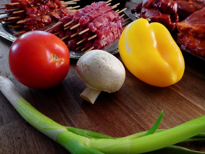 Keywords: meat raw tasty food grill grilled meats frisch eat barbecue prepare marinade marinated vegetables mushroom tomato onion paprika spit
