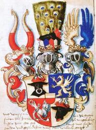 | Keywords: Mecklenburg Wappen 1524.jpg Combined arms of the House of Mecklenburg During the 15th century the Dukes of Mecklenburg gradually acquired the Lordship of Werle and the Duchy of Mecklenburg-Stargard For Werle the bull's head with extended tongue but without the skin in the neck was taken but for Stargard no arms or symbol existed For unknown reasons a woman's arm with a ring was chosen as a symbol to represent Stargard in the new arms The open mouth of the original Mecklenburg bull was changed into a nose-ring and the bull's head of Werle was rotated 45 degrees Illumination 1524 Author This image is in the public domain due to its age PD-old-100 Wappenrecht House of Mecklenburg Marshalled Schwerin inverse |