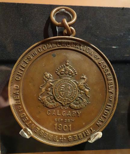Keywords: Medal commemorating visit of Duke and Duchess of Cornwall (later King George V and Queen Mary) to Siksika peoples near Calgary, 1901, view 1 - Glenbow Museum - DSC01090.JPG en Exhibit in the Glenbow Museum 130 9th Ave S E Calgary Alberta Canada This work is old enough so that it is in the public domain Photography was permitted in the museum without restriction 2013-09-21 12 52 48 own Daderot cc-zero Uploaded with UploadWizard Indigenous cultures in the Glenbow Museum Siksika Nation George V of the United Kingdom on medals |