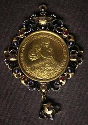 Keywords: Medal of Władysław IV Vasa.jpg Pendant with medal of Władysław IV Zawieszenie z medalem Władysława IV Gold silver enamel 4 rubies 5 diamonds Kraków Institution Wawel Royal Castle Medal minted in honor of King Władysław IV Inicials on the frame A DIX F of Kraków's goldsmith Adalbert Wojciech Dixon of Aberdeen d 1653 <br> The medals of sovereigns often framed in gold were presented as a special award or replace state awards The practice initiated in Poland by King Sigismund Augustus spread widely at the court of the Vasas Among the recipients were Franciszek Mniszech False Dmitriy I Bartłomiej Nowodworski papal nuncio Claudio Rangoni Muscovy envoy Denis Grigorievich Aladyin april 1613 Duke of Pomerania and the Elector of Brandenburg Object history own BurgererSF 6009 ca 1640 Sebastian Dadler medal Adalbert Dixon frame Copyright expired PD-Art Other versions <gallery>File Mikalojus Kristupas ir Marija Eleonora Chaleckiai jpg</gallery> Cc-zero Sebastian Dadler Adalbert Dixon Crown Treasury of the Wawel Castle Pendants from the Polish Vasa Collection Medals of Poland 1640s medals |