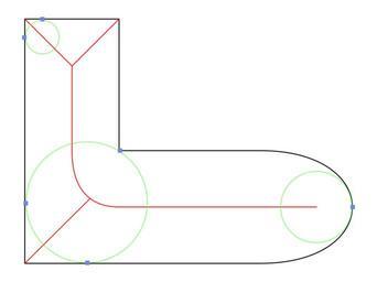 Keywords: Medial axis example 2d.svg en A simple example of a two-dimensional bordered area in black with its medial axis in red The medial axis consists of line- and parabola-elements Three maximal circles are shown in green with their footpoints in blue on the boundary They belong to different classes 1 the general case with two touching footpoints circle centre lies on a curve; 2 the case with three footpoints circle center is a branching point where curves meet; and 3 the case with one footpoint circle centre is a curvature centre of the boundary de Ein einfaches Beispiel eines zweidimensionalen berandeten Gebietes schwarz mit seiner Medialen Achse rot die aus Geraden- und Parabel-Elementen besteht Es sind drei maximale Kreise grün mit ihren Berührpunkten blau auf dem Rand eingezeichnet Sie gehören zu drei verschiedenen Klassen 1 der allgemeine Fall mit zwei Berührpunkten der Kreismittelpunkt liegt auf einem Kurvenstück; 2 der Fall mit drei Berührpunkten der Kreismittelpunkt ist ein Verzweigungspunkt in dem sich mehrere Kurvenstücke treffen; und 3 der Fall mit einem Berührpunkt der Kreismittelpunkt ist Krümmungszentrum der Randkurve own Pblanke 2010-03-22 Geometry diagrams |
