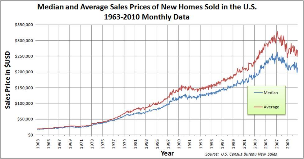 Keywords: Median and Average Sales Prices of New Homes Sold in the US 1963-2010 Monthly.png graph en Chart showing the median and average sales prices read USD as USD or US ignore symbols in vertical axis labels of new homes sold in the United States by month/year Based on http //www census gov/ftp/pub/const/usprice_cust xls US Census Median and Average Sales Price of New Houses Sold Data Please note that the sales price includes land Also the average from 1963 to 1974 inclusively is annual and not monthly own Smallman12q 2010-01-22 sortable wikitable center style background f0f0f0; Period center style background f0f0f0; Median center style background f0f0f0; Average - Jan 1963 17 200 19 300 - Feb 1963 17 700 19 300 - Mar 1963 18 200 19 300 - Apr 1963 18 200 19 300 - May 1963 17 500 19 300 - Jun 1963 18 000 19 300 - Jul 1963 18 400 19 300 - Aug 1963 17 800 19 300 - Sep 1963 17 900 19 300 - Oct 1963 17 600 19 300 - Nov 1963 18 400 19 300 - Dec 1963 18 700 19 300 - Jan 1964 17 800 20 500 - Feb 1964 18 000 20 500 - Mar 1964 19 000 20 500 - Apr 1964 18 800 20 500 - May 1964 19 300 20 500 - Jun 1964 18 800 20 500 - Jul 1964 19 100 20 500 - Aug 1964 18 900 20 500 - Sep 1964 18 900 20 500 - Oct 1964 18 900 20 500 - Nov 1964 19 300 20 500 - Dec 1964 21 000 20 500 - Jan 1965 20 700 21 500 - Feb 1965 20 400 21 500 - Mar 1965 19 800 21 500 - Apr 1965 19 900 21 500 - May 1965 19 600 21 500 - Jun 1965 19 800 21 500 - Jul 1965 21 000 21 500 - Aug 1965 20 200 21 500 - Sep 1965 19 600 21 500 - Oct 1965 19 900 21 500 - Nov 1965 20 600 21 500 - Dec 1965 20 300 21 500 - Jan 1966 21 200 23 300 - Feb 1966 20 900 23 300 - Mar 1966 20 800 23 300 - Apr 1966 23 000 23 300 - May 1966 22 300 23 300 - Jun 1966 21 200 23 300 - Jul 1966 21 800 23 300 - Aug 1966 20 700 23 300 - Sep 1966 22 200 23 300 - Oct 1966 20 800 23 300 - Nov 1966 21 700 23 300 - Dec 1966 21 700 23 300 - Jan 1967 22 200 24 600 - Feb 1967 22 400 24 600 - Mar 1967 22 400 24 600 - Apr 1967 22 300 24 600 - May 1967 23 700 24 600 - Jun 1967 23 900 24 600 - Jul 1967 23 300 24 600 - Aug 1967 21 700 24 600 - Sep 1967 22 800 24 600 - Oct 1967 22 300 24 600 - Nov 1967 23 100 24 600 - Dec 1967 22 200 24 600 - Jan 1968 23 400 26 600 - Feb 1968 23 500 26 600 - Mar 1968 24 600 26 600 - Apr 1968 24 500 26 600 - May 1968 25 300 26 600 - Jun 1968 25 400 26 600 - Jul 1968 24 600 26 600 - Aug 1968 25 000 26 600 - Sep 1968 25 000 26 600 - Oct 1968 25 600 26 600 - Nov 1968 24 600 26 600 - Dec 1968 26 500 26 600 - Jan 1969 24 600 27 900 - Feb 1969 26 000 27 900 - Mar 1969 26 200 27 900 - Apr 1969 25 900 27 900 - May 1969 26 900 27 900 - Jun 1969 25 200 27 900 - Jul 1969 26 800 27 900 - Aug 1969 24 900 27 900 - Sep 1969 26 000 27 900 - Oct 1969 24 400 27 900 - Nov 1969 24 900 27 900 - Dec 1969 25 100 27 900 - Jan 1970 23 600 26 600 - Feb 1970 24 100 26 600 - Mar 1970 24 100 26 600 - Apr 1970 24 200 26 600 - May 1970 25 700 26 600 - Jun 1970 23 800 26 600 - Jul 1970 22 900 26 600 - Aug 1970 23 500 26 600 - Sep 1970 22 600 26 600 - Oct 1970 22 100 26 600 - Nov 1970 23 500 26 600 - Dec 1970 22 300 26 600 - Jan 1971 23 900 28 300 - Feb 1971 24 500 28 300 - Mar 1971 24 300 28 300 - Apr 1971 25 800 28 300 - May 1971 25 500 28 300 - Jun 1971 26 100 28 300 - Jul 1971 25 200 28 300 - Aug 1971 25 300 28 300 - Sep 1971 25 400 28 300 - Oct 1971 25 600 28 300 - Nov 1971 25 700 28 300 - Dec 1971 25 300 28 300 - Jan 1972 24 700 30 500 - Feb 1972 26 500 30 500 - Mar 1972 27 400 30 500 - Apr 1972 26 700 30 500 - May 1972 27 000 30 500 - Jun 1972 26 800 30 500 - Jul 1972 27 700 30 500 - Aug 1972 28 100 30 500 - Sep 1972 28 000 30 500 - Oct 1972 28 900 30 500 - Nov 1972 29 100 30 500 - Dec 1972 29 700 30 500 - Jan 1973 29 900 35 500 - Feb 1973 29 700 35 500 - Mar 1973 31 400 35 500 - Apr 1973 32 800 35 500 - May 1973 32 000 35 500 - Jun 1973 33 100 35 500 - Jul 1973 34 200 35 500 - Aug 1973 33 200 35 500 - Sep 1973 33 200 35 500 - Oct 1973 33 300 35 500 - Nov 1973 34 000 35 500 - Dec 1973 35 700 35 500 - Jan 1974 34 200 38 900 - Feb 1974 34 900 38 900 - Mar 1974 36 000 38 900 - Apr 1974 35 700 38 900 - May 1974 35 700 38 900 - Jun 1974 35 100 38 900 - Jul 1974 36 800 38 900 - Aug 1974 35 700 38 900 - Sep 1974 36 200 38 900 - Oct 1974 37 200 38 900 - Nov 1974 37 300 38 900 - Dec 1974 37 400 38 900 - Jan 1975 37 200 39 500 - Feb 1975 37 900 40 600 - Mar 1975 38 800 42 100 - Apr 1975 39 200 42 000 - May 1975 39 500 43 200 - Jun 1975 37 900 42 500 - Jul 1975 38 600 42 300 - Aug 1975 38 200 41 200 - Sep 1975 39 700 43 400 - Oct 1975 40 700 43 900 - Nov 1975 41 100 43 700 - Dec 1975 42 100 45 900 - Jan 1976 41 600 45 300 - Feb 1976 42 700 45 900 - Mar 1976 43 600 46 800 - Apr 1976 43 300 46 800 - May 1976 43 600 47 500 - Jun 1976 46 100 49 200 - Jul 1976 44 600 48 000 - Aug 1976 44 200 48 500 - Sep 1976 44 700 48 200 - Oct 1976 45 300 50 400 - Nov 1976 45 800 50 000 - Dec 1976 45 900 50 600 - Jan 1977 45 500 50 700 - Feb 1977 47 400 52 600 - Mar 1977 46 200 51 600 - Apr 1977 48 700 54 600 - May 1977 49 300 54 400 - Jun 1977 48 700 53 900 - Jul 1977 48 600 53 600 - Aug 1977 49 000 54 300 - Sep 1977 48 500 53 900 - Oct 1977 51 400 57 200 - Nov 1977 51 800 57 800 - Dec 1977 52 700 57 600 - Jan 1978 52 300 58 500 - Feb 1978 53 200 59 100 - Mar 1978 53 200 59 900 - Apr 1978 53 300 59 300 - May 1978 55 700 62 300 - Jun 1978 56 700 63 200 - Jul 1978 54 800 62 900 - Aug 1978 56 100 63 000 - Sep 1978 57 300 64 400 - Oct 1978 58 300 65 700 - Nov 1978 58 700 66 300 - Dec 1978 59 900 67 400 - Jan 1979 60 300 67 700 - Feb 1979 61 200 68 700 - Mar 1979 60 400 68 500 - Apr 1979 62 600 71 000 - May 1979 62 800 71 800 - Jun 1979 64 200 74 300 - Jul 1979 63 800 71 900 - Aug 1979 64 000 74 000 - Sep 1979 66 000 76 800 - Oct 1979 62 300 71 500 - Nov 1979 63 900 74 200 - Dec 1979 61 500 72 600 - Jan 1980 62 900 72 400 - Feb 1980 64 900 76 600 - Mar 1980 62 600 71 600 - Apr 1980 63 100 74 600 - May 1980 63 100 72 800 - Jun 1980 64 900 75 600 - Jul 1980 64 000 76 700 - Aug 1980 63 400 76 000 - Sep 1980 68 300 80 100