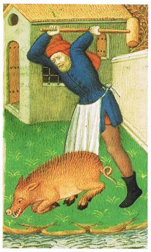 | Keywords: Medieval pig slaughter.jpg Killing a domestic pig for slaughter British Library London Scanned from Maggie Black's Den medeltida kokboken Swedish translation of The Medieval Cookbook ISBN 91-7712-380-8 PD-art PD-old-auto Slaughtering in art Paintings of pigs Aprons in art Late medieval way of life 12th-15th centuries Medieval miniature of pigs Artworks missing infobox template |