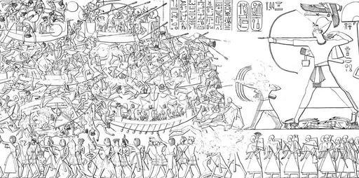 | Keywords: Medinet Habu Ramses III. Tempel Nordostwand Abzeichnung 01.jpg de Umzeichnung des Seevölkerkrieges an der Nordostwand des Totentempels Ramses ™ III in Medinet Habu Ă„gypten Dorothea Gray Seewesen Archaeologia Homerica Band I Kapitel G Göttingen 1974 S 166/167 1200 “1150 B C author PD-old-100 Seevölker jpg Navy of Egypt Ramses III Sea Peoples Northeast wall of Medinet Habu Temple Reliefs in Medinet Habu Temple - details Ancient Egyptian Navy Naval battle of Delta | ||||