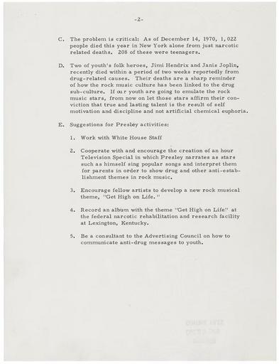 | Keywords: Meeting Agenda - Page 2 of 2.jpg en Memorandum for President Nixon Re Meeting with Elvis Presley 21 December 1970 http //www archives gov/exhibits/nixon-met-elvis/main php United States Government 1970-12-21 The Subject Files Finding Aid Health boxes EX HE 5-1 PD-USGov-POTUS PD-USGov Elvis Presley War on Drugs in the United States |