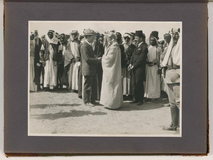 | Keywords: Meetings of British, Arab, and Bedouin officials in Amman, Jordan, April 1921 - File 12.tif en Photographs show meetings between Arab Bedouin and British officials around April 17-27 1921 at Amir Abdullah ibn Hussein's camp at Amman Jordan During these meetings British High Commissioner Herbert Samuel proclaimed Amir Abdullah as the ruler of Transjordan under British protection Among the persons depicted are Amir Abdullah John D Whiting possibly Sheik Sultan of the Belka Sultan ibn 'Ali id Diab ul 'Adwan Amir Shaker bin Zeid future Regent of Transjordan Bedouin chief Auda Abu Tayi Sheik Majid Pasha el Adwan Herbert Samuel British civil administrator Wyndham Deedes British diplomat Albert Abramson T E Lawrence Lawrence of Arabia and possibly Iraq civil administrator Gertrude Bell Also shown are horse racing an airplane landing at Abdullah's camp Circassian leaders Abudullah's bodyguard on camels and Herbert Samuel reading his proclamation of Abdullah as leader of Transjordan Reproduction Number LC-DIG-ppmsca-15304 digital files of original photos LC-DIG-ppmsca-15305 digital files of album pages Rights Advisory No known restrictions on publication Access Advisory For reference access please use the digital images in the online catalog to preserve the fragile original items Notes Photographs were created by the photographers of the American Colony Photo Department located in Jerusalem Founded in the late 1890s by Elijah Meyers the photo agency was headed during its heyday ca 1903-1933 by Lewis Larsson whose staff photographers included Erik Lind Lars Lind Furman Baldwin and G Eric Matson It transitioned into the Matson Photo Service around 1940 with photography by Matson Hanna Safieh Joseph H Giries and others John D Whiting contributed periodically to the work of both agencies The images in this album were probably taken by Lewis Larsson and/or Eric Matson For more information see http //hdl loc gov/loc pnp/pp matpc and http //www loc gov/rr/print/coll/629_whiting html Some caption information for these photographs based on information from matching negatives in the G Eric and Edith Matson Photograph Collection LC-M32-1942 LC-M32-1952 LC-M32-1951 LC-M32-1954 LC-M32-1956 M32-1957 and LC-M32-50280-x Album unpaginated album page numbers supplied by Library staff Pages 1-2 and verso of each page are blank One unattached photograph was found with the album and is stored with it Photograph is a portrait of a Jordanian man in traditional dress Blind stamp Hagop Berberian Amman Stamped on verso Copyright reserved By appointment to H M the King photographers Hagop Berberian Son More information about the events and people depicted in the album are available in the John D Whiting Supplementary Archive Box 1 LOT title devised by Library staff John D Whiting's diaries correspondence and other materials are located in the Library of Congress Manuscript Division Papers of John D Whiting Forms part of Visual materials from the papers of John D Whiting Library of Congress Transfer; Manuscript Division; 2006; DLC/PP-2006 051 29 Subjects Samuel Herbert Louis Samuel --Viscount --1870-1963 Lawrence T E -- Thomas Edward --1888-1935 Abdullah --King of Jordan --1882-1951 Deedes Wyndham Henry --Sir --1883-1956 Shākir ibn Zayd --Prince son of Zayd ibn Fawwāz Amir of Ṭāʾif --1885-1934 Bell Gertrude Lowthian --1868-1926 Jordan--History--1919-1946 American Colony Jerusalem --People--1920-1930 British--Jordan--Amman--1920-1930 Arabs--Jordan--Amman--1920-1930 Bedouins--Jordan--Amman--1920-1930 Circassians--Jordan--Amman--1920-1930 Tribal chiefs--Jordan--Amman--1920-1930 Meetings--Jordan--Amman--1920-1930 Camps--Jordan--Amman--1920-1930 Government officials--Jordan--Amman--1920-1930 Biplanes--Jordan--Amman--1920-1930 Proclamations--Jordan--Amman--1920-1930 April 17-27 1921 http //www loc gov/pictures/item/mpc2010001545/PP/resource/ Whiting John D John David 1882-1951 photographer Larsson Lewis photographer Matson G Eric Gästgifvar Eric 1888-1977 photographer other versions Wikimedia Levant - GLAM PD-Jordan 1921 Herbert Samuel and Amir Abdullah meetings |