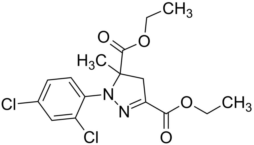Keywords: Mefenpyr-diethyl 200.svg validSVG Structure of diethyl 1- 2 4-dichlorophenyl -5-methyl-4 5-dihydro-1H-pyrazole-3 5-dicarboxylate Own 2014-06-08 Emeldir <span class signature-talk ></span> Chemical structure verified https //upload wikimedia org/wikipedia/commons/4/46/Mefenpyr-diethyl_200 svg 1S/C16H18Cl2N2O4/c1-4-23-14 21 12-9-16 3 15 22 24-5-2 20 19-12 13-7-6-10 17 8-11 13 18/h6-8H 4-5 9H2 1-3H3 OPGCOAPTHCZZIW-UHFFFAOYSA-N 135590-91-9 Synonyms <small>1- 2 4-Dichlorophenyl -4 5-dihydro-5-methyl-1H-pyrazole-3 5-dicarboxylic acid diethyl ester Diethyl RS -1- 2 4-dichlorophenyl -5-methyl-2-pyrazoline-3 5-dicarboxylate Mefenpyr-diethyl</small> PD-chem Carboxylate esters Ethyl esters Dichlorobenzenes Pyrazoles Herbicide safener |