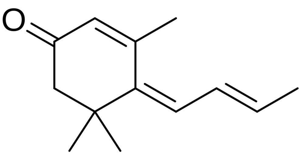 Keywords: Megastigmatrienone.svg Chemical structure of megastigmatrienone tabanone Own 20 35 22 September 2016 UTC Ed Edgar181 Cyclohexenes Ketones
