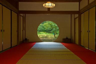 Keywords: Meigetsu-in September.jpg Meigetsu-in in Kamakura The blue dot is a Jizō statue wearing a jacket Own 2008-09-15 Urashimataro Public Domain Meigetsuin