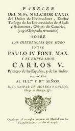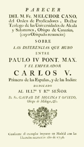 Keywords: Melchor Cano (15-11-1555) Parecer del M. fr. Melchor Cano (edición de 1736).png Melchor Cano del Orden de Predicadores Doctor Teólogo de las Universidades de Alcalá y Salamanca Obispo de Canarias cuyo Obispado renunció sobre las diferencias que hubo entre Paulo IV Pont max Y el emperador Carlos V Primero de las Españas y de las Indias Dedicado al Ilmo y Rmo Señor D fr Gaspar de Molina y Oviedo Obispo de Málaga c Conforme al exemplar impreso en Madrid con las Licencias necesarias año de 1736 Texto original Valladolid 15 de noviembre de 1555 1736 http //www cervantesvirtual com/bib/historia/CarlosV/melchor shtml Cano M Sobre las diferencias que hubo entre Paulo IV Pont max Y el emperador Carlos V Primero de las Españas y de las Indias Madrid 1736 Melchor Cano PD-old-100 PD-old-100 1736 books Spain in the 1550s Melchor Cano Books published in Madrid Books in Spanish Frontispieces from Spain Files by User Raimundo Pastor portadas |