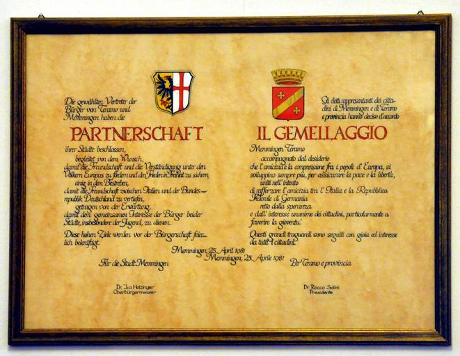 Keywords: Memmingen Rathaus EG Sitzungssaal Partnerschaft Teramo.jpg Memmingen Rathaus Sitzungssaal im Erdgeschoss Urkunde zur Städtepartnerschaft mit Teramo Italien own own photograph 2011-11 1991 Photo Andreas Praefcke Interior of the town hall of Memmingen Photos by User AndreasPraefcke Town twinning in Germany History of Memmingen Teramo Coats of arms in Memmingen Coats of arms of Memmingen |
