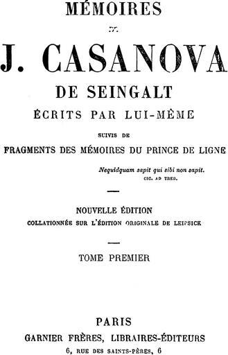 Keywords: MemoirsCasanova.jpg Title page of Mémoires de J Casanova de Seingalt by Giacomo Casanova 1725-1798 Giacomo Casanova Mémoires de J Casanova de Seingalt écrits par lui-même Paris Garnier Frères 1910 1880 edition <br>http //gallica bnf fr/ark /12148/bpt6k314854/f4 table alternate scan from Gallica 1910 1880 edition Giacomo Casanova adapted by Jean Laforgue This image is in the public domain PD-old __NOTOC__ Histoire de ma vie Title pages from France 1910 works |