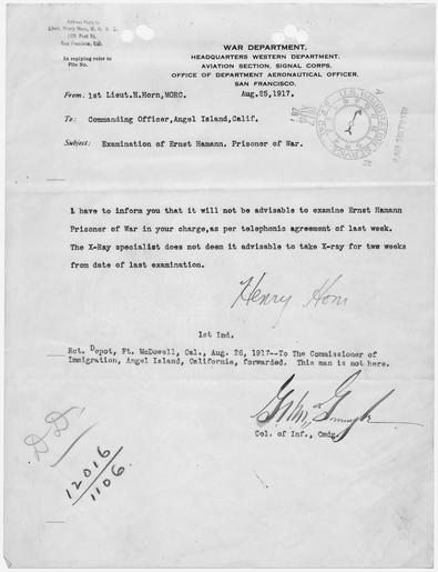 | Keywords: Memorandum from Lieutenant H. Horn to Commanding Officer, Angel Island Station - NARA - 296436.tif Scope and content This document is from a case concerning German native Ernst Hamann who had the misfortune to arrive in the U S a few days after President Wilson's anti-enemy alien proclamation of April 6 1917 Hamann was interned on Angel Island in San Francisco Bay General notes 296436 Local identifier Department of Justice Immigration and Naturalization Service San Francisco District Office - NARA's Pacific Region San Bruno NRHAS 1000 Commodore Drive San Bruno CA 94066-2350 1917-08-25 Record group Record Group 85 Records of the Immigration and Naturalization Service 1787 - 2004 Record group ARC 414 Case Files of Investigations Not Resulting in Warrant Proceedings in the San Francisco District and Investigations Within the San Francisco District at the Request of Other Service Offices compiled 1912 - 1944 Series ARC 296429 File unit Investigation Case File 12016/01106 -- Enemy Aliens 1916 - 1929 File unit ARC 296430 Variant control numbers NAIL Control Number NRHS-85-INSSF-HAMANN1106-6 yes Other versions <gallery> File Memorandum_from_Lieutenant_H _Horn_to_Commanding_Officer _Angel_Island_Station_-_NARA_-_296436 tif tif File Memorandum_from_Lieutenant_H _Horn_to_Commanding_Officer _Angel_Island_Station_-_NARA_-_296436 jpg jpg </gallery> NARA-cooperation PD-USGov Immigrants to the United States Internment in World War I Documents related to Angel Island German American history NARA TIF images with categorized JPGs |