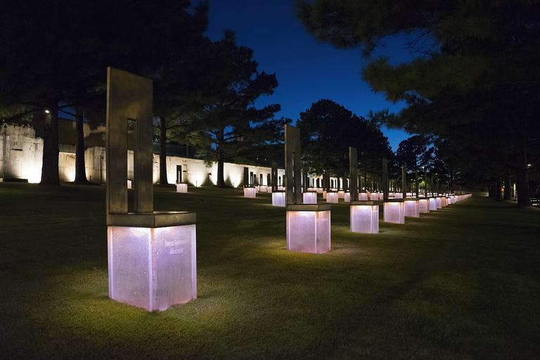 Keywords: memorial chairs night america usa landmark architecture symbol famous historic history monument oklahoma city grass lawn light lighted empty