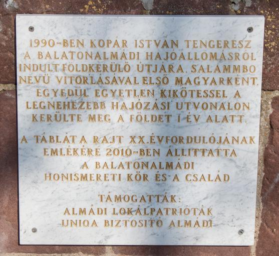 Keywords: Memorial plaque of the circumnavigation by István Kopár in Balatonalmádi.jpg Memorial plaque of the circumnavigation by István Kopár in Balatonalmádi Kopár István Föld körüli hajózásának emléktáblája Balatonalmádi own 2014-02-24 Szilas FoP-Hungary Commonist Transport in Balatonalmádi Plaques in Veszprém County István Kopár 2010 works in Hungary |