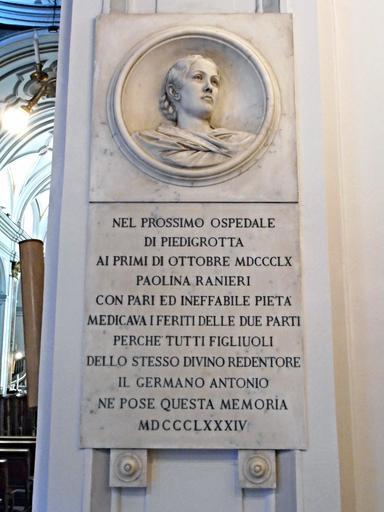| Keywords: paolina ranieri paolinaranieri antonio ranieri antonioranieri giacomo leopardi giacomoleopardi naples italy "Il Ranieri fece erigere un monumento alla sorella in camposanto, e fin qui nulla di strano: ma si spinse, lui inveterato mangiapreti, a supplicare e brigare per ottenere che nella chiesa di Santa Chiara, ove son le tombe dei re di Napoli, sorgesse un grande monumento davanti al quale egli spesso si recava non a pregare ma a piangere (secondo l'atto notorio presentato dagli eredi); fece porre un medaglione marmoreo nella chiesa di Piedigrotta col pretesto che la defunta nel 1860 aveva amorevolmente curato i garibaldini feriti nella battaglia del Volturno. L'inventario dell'eredità mostrava poi che fotografie di Paolina, del monumento di Santa Chiara, del medaglione di Piedigrotta pendevano da tutte le pareti della sua casa in via Nuova Capodimnte e della sua casina di Portici, trasformate ambedue in musei nei quali non si poteva toccar nulla per non mutare la disposizione data dalla defunta. E il senatore, gloria partenopea, andava sovente nella casa di via Nuova Capodimonte (quando abitava a Portici) "imaginando di riveder la sorella ed aspettandola ritto a piè della scala, ma, trascorsa l'ora stabilita, rientrava nella vettura e tornava a Portici". (Mario Picchi, "Storie di Casa Leopardi", Rizzoli) La foto mostra la memoria con ritratto di Paolina Ranieri (Napoli 1817-Napoli 1878) nella chiesa di Piedigrotta a Napoli, che il destino ha voluto ad un centinaio di metri dalla tomba di Leopardi. "Il Ranieri fece erigere un monumento alla sorella in camposanto, e fin qui nulla di strano: ma si spinse, lui inveterato mangiapreti, a supplicare e brigare per ottenere che nella chiesa di Santa Chiara, ove son le tombe dei re di Napoli, sorgesse un grande monumento davanti al quale egli spesso si recava non a pregare ma a piangere (secondo l'atto notorio presentato dagli eredi); fece porre un medaglione marmoreo nella chiesa di Piedigrotta col pretesto che la defunta nel 1860 aveva amorevolmente curato i garibaldini feriti nella battaglia del Volturno. L'inventario dell'eredità mostrava poi che fotografie di Paolina, del monumento di Santa Chiara, del medaglione di Piedigrotta pendevano da tutte le pareti della sua casa in via Nuova Capodimnte e della sua casina di Portici, trasformate ambedue in musei nei quali non si poteva toccar nulla per non mutare la disposizione data dalla defunta. E il senatore, gloria partenopea, andava sovente nella casa di via Nuova Capodimonte (quando abitava a Portici) "imaginando di riveder la sorella ed aspettandola ritto a piè della scala, ma, trascorsa l'ora stabilita, rientrava nella vettura e tornava a Portici". (Mario Picchi, "Storie di Casa Leopardi", Rizzoli) La foto mostra la memoria con ritratto di Paolina Ranieri (Napoli 1817-Napoli 1878) nella chiesa di Piedigrotta a Napoli, che il destino ha voluto ad un centinaio di metri dalla tomba di Leopardi. |