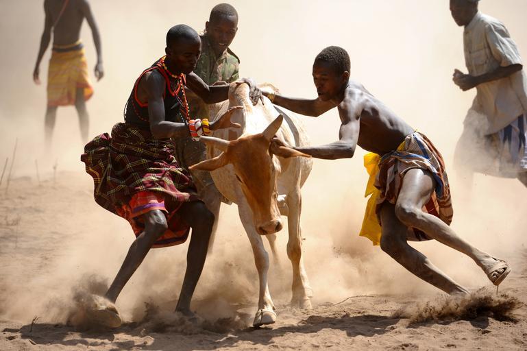 Keywords: men subdue runaway bull Daaba Kenya