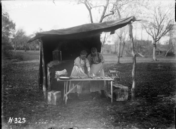 | Keywords: the great war thegreatwar great war greatwar world war one worldwarone world war i worldwari wwi first world war firstworldwar new zealand expeditionary force newzealandexpeditionaryforce nzef field kitchen fieldkitchen blackandwhite monochrome outdoor black and white Men making sausage rolls for soldiers of the Otago Battalion in Selle, France, on 26 October 1917. Photograph taken by Henry Armytage Sanders. Inscriptions: Inscribed - Photographer's title on negative -bottom left: H325. Quantity: 1 b&w original negative(s). Physical Description: Dry plate glass negative 4.75 x 6.5 inches Men making sausage rolls, Selle, France. Royal New Zealand Returned and Services' Association :New Zealand official negatives, World War 1914-1918. Ref: 1/2-012966-G. Alexander Turnbull Library, Wellington, New Zealand. natlib.govt.nz/records/22795823 Men making sausage rolls for soldiers of the Otago Battalion in Selle, France, on 26 October 1917. Photograph taken by Henry Armytage Sanders. Inscriptions: Inscribed - Photographer's title on negative -bottom left: H325. Quantity: 1 b&w original negative(s). Physical Description: Dry plate glass negative 4.75 x 6.5 inches Men making sausage rolls, Selle, France. Royal New Zealand Returned and Services' Association :New Zealand official negatives, World War 1914-1918. Ref: 1/2-012966-G. Alexander Turnbull Library, Wellington, New Zealand. natlib.govt.nz/records/22795823 |