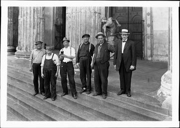 Keywords: field columbian museum chicago men hats caps kitty cat feline animal mammal steps usa carpenters staff suspenders overalls bow tie bowtie statue columns field columbian museum fieldcolumbianmuseum jackson park jacksonpark illinois 1914 blackandwhite monochrome black and white Six men on west steps, one holding small cat. Staff of unidentified carpenters, all wearing hats, some wearing suspenders, some in overalls, one wearing a bow tie. Unidentified male statue leaning against column. Exterior of Field Columbian Museum building. Jackson Park, Chicago, Illinois. 1914. Original size and material: 5x7 inch glass negative Digital Identifier: CSB39421 Part of the Illinois Urban Landscapes Project: www.fieldmuseum.org/urbanlandscapes/ Six men on west steps, one holding small cat. Staff of unidentified carpenters, all wearing hats, some wearing suspenders, some in overalls, one wearing a bow tie. Unidentified male statue leaning against column. Exterior of Field Columbian Museum building. Jackson Park, Chicago, Illinois. 1914. Original size and material: 5x7 inch glass negative Digital Identifier: CSB39421 Part of the Illinois Urban Landscapes Project: www.fieldmuseum.org/urbanlandscapes/ |