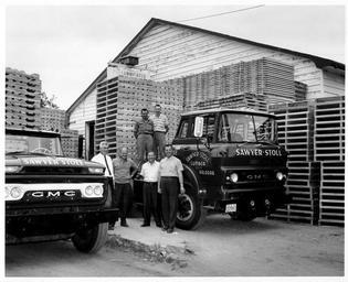 Keywords: kaladar lumber mill lumbermill massanoga mill sawmill bay sawmillbay tweed sawyer stoll sawyerstoll truck gmc blackandwhite monochrome black and white Unknown date of photo. Pictured are men and trucks at the Tweed Plant. The planing mill originally located at the Massanoga mill (north end of Mazinaw Lake) was re-located to Kaladar where it could also dress the lumber shipped in by rail from the company's other operations in Renfrew County. Challenged by cheaper lumber being shipped into Ontario by rail from the huge lumbering operations in British Columbia, by 1958 Sawyer Stoll was forced to sell its Kaladar mill and consolidate its operations in Tweed. Four years later Sawyer Stoll closed the Massanoga mill. Several years later a partial recovery in the Ontario market saw the start up of operations again but in 1975 a fire destroyed the Massanoga mill. It was replaced by a portable mill for a few years but eventually the operation was relocated in Eganville to the north where the firm had purchased timber rights. Part of the Jean Armstrong Collection Note: All CDHS Flickr content is available for the public use (non-commercial) providing our Rights Statement is followed: pioneer.mazinaw.on.ca/flickr_statement.php The information above was cited from: 'The Mazinaw Experience- Bon Echo and Beyond' by John Campbell. It is available in the CDHS online bookstore: www.cloynepioneermuseum.ca Unknown date of photo. Pictured are men and trucks at the Tweed Plant. The planing mill originally located at the Massanoga mill (north end of Mazinaw Lake) was re-located to Kaladar where it could also dress the lumber shipped in by rail from the company's other operations in Renfrew County. Challenged by cheaper lumber being shipped into Ontario by rail from the huge lumbering operations in British Columbia, by 1958 Sawyer Stoll was forced to sell its Kaladar mill and consolidate its operations in Tweed. Four years later Sawyer Stoll closed the Massanoga mill. Several years later a partial recovery in the Ontario market saw the start up of operations again but in 1975 a fire destroyed the Massanoga mill. It was replaced by a portable mill for a few years but eventually the operation was relocated in Eganville to the north where the firm had purchased timber rights. Part of the Jean Armstrong Collection Note: All CDHS Flickr content is available for the public use (non-commercial) providing our Rights Statement is followed: pioneer.mazinaw.on.ca/flickr_statement.php The information above was cited from: 'The Mazinaw Experience- Bon Echo and Beyond' by John Campbell. It is available in the CDHS online bookstore: www.cloynepioneermuseum.ca |