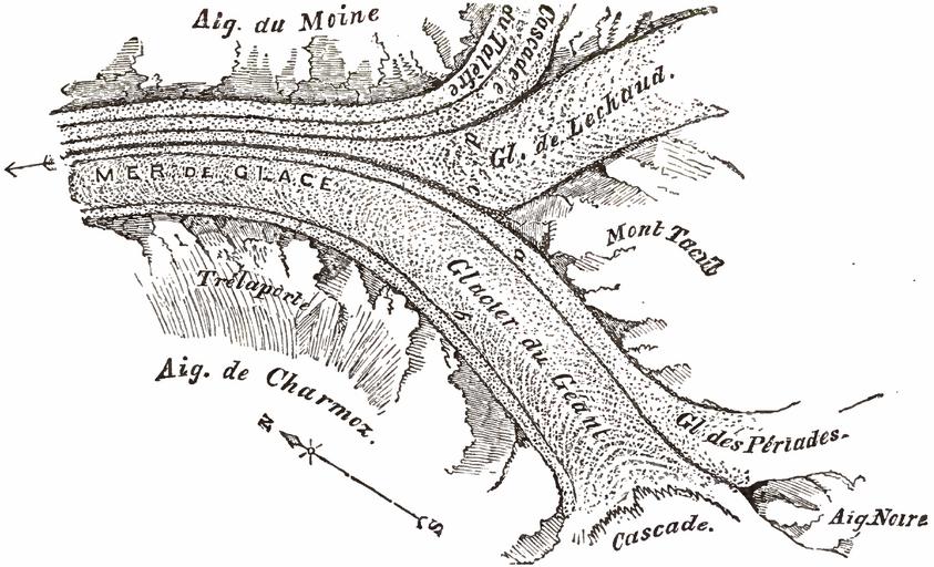 Keywords: Mer de Glace sketchmap by John Tyndall, 1857, from 1896 edition.png Mer de Glace sketchmap by John Tyndall 1857 Fig 7<ref>Tyndall page 53 Fig 7 </ref> shows Aiguille Noire to the south bottom-right dividing the Cascade at the west bottom from Glacier des Périades right which flows north to join Glacier du Géant flowing south to north 14 degrees clockwise between Mont Tacul on the east centre right and Aiguilles de Charmoz to the west bottom alongside morraine 'b' This forms the medial morraine 'a' Some 3 kilometres downstream Glacier de Lechaud joins du Géant forming medial morraine 'c' Just prior to this confluence Cascade du Talèfre with its own medial morraine 'e' joins Lechaud forming morraine 'd' Here the glacier is known as the Mer De Glace and flows north-north-west leftwards between Aiguille du Moine on the east and Trélaporte on the west Notes 2 References cite book The Glaciers of the Alps John Tyndall 1896 Longmans Green and Co http //www archive org/details/glaciersalpsbeing00tyndrich 2008-02-29 PDF from http //www archive org/details/glaciersalpsbeing00tyndrich or alternative http //books google it/books id 8_cN1DQ3mZ4C printsec frontcover hl en PPA53 M1 1896 John Tyndall 1820-1893 PD-old Maps of glaciers Mer de Glace Glacier de Leschaux Glacier du Tacul Glacier de Trélaporte Glacier des Périades Glacier de Talèfre John Tyndall 1896 maps Maps of Haute-Savoie Engraved maps Maps of confluences of glaciers |