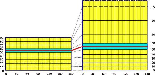 Keywords: Mercator by Wright stretching.svg en Showing how Edward Wright calculated the Mercator parallels On an equirectangular projection calculate the parallel scale factor for one strip at mid height and use this value to widen the strip Wright actually used 540 strips 1599 and later 5400 strips 1610 to obtain highly accurate results own Peter Mercator 2010-08-06 cc-zero Mercator projections Edward Wright mathematician SVG diagrams Diagrams labelled with numbers only |