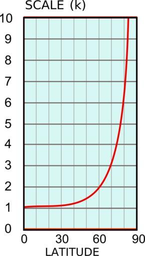 Keywords: Mercator scale plot.svg en The scale factor as a function of latitude in the Mercator projection own Peter Mercator 2010-08-06 Mercator projections Geometry diagrams Geographic diagrams