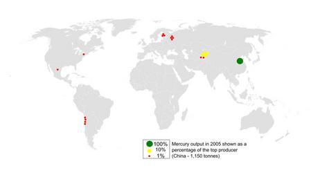 Keywords: Mercury output2.svg en Bubble map of mercury production in 2005 Shown as a percentage of the top producer China - 1 150 tonnes own My Ubuntu 2010-06-11 Based on BlankMap-World6 svg using data from Mercury_output2 png Created with Inkscape Mercury Bubble maps |