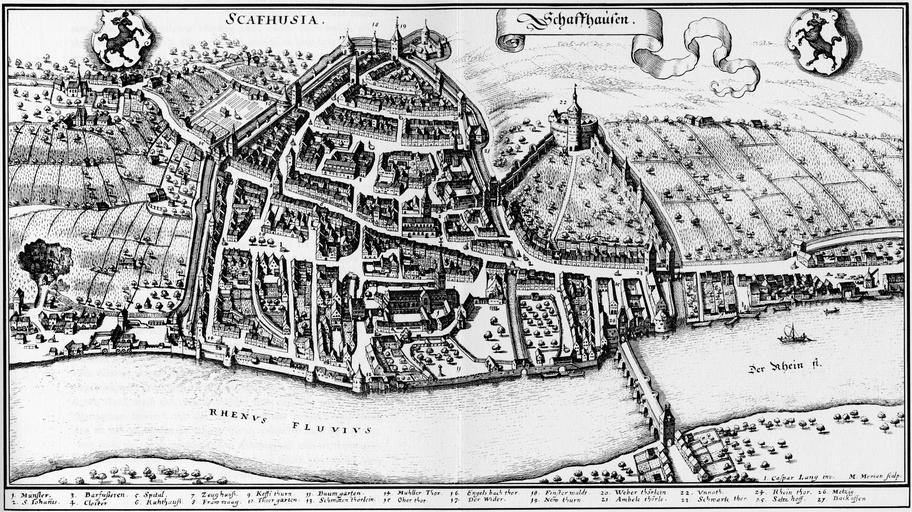 Keywords: Merian Schaffhausen 1642.jpg de Ansicht der Stadt Schaffhausen Schweiz 1642 Topographia Helvetiae Rhaetiae et Valesiae Creator Matthäus Merian ; upload by sidonius talk 09 17 4 July 2008 UTC 1642 Schaffhausen in art Munot in art Maps of Schaffhausen Engravings by Matthäus Merian Merian Helvetiae 1642 in Switzerland Engravings of cities in Switzerland PD-old-100 |