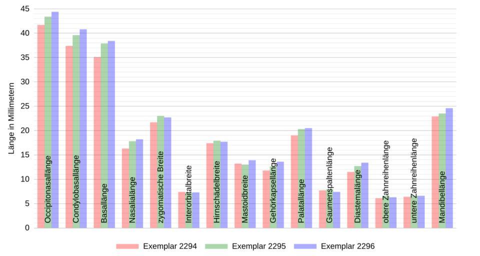 Keywords: Meriones persicus, YiÄŸit & Çolak 1999, skull measurements (DE).svg de Schädelmaße dreier erwachsener männlicher Persischer Rennmäuse Meriones persicus aus Oltu Erzurum Türkei auf Deutsch en Skull measurements of three adult male Persian Jirds Meriones persicus from Oltu Erzurum Turkey in German own Torben Schink 2011-01-13 nach Nuri YiÄŸit Ercüment Çolak A study of the taxonomy and karyology of Meriones persicus Blanford 1875 Mammalia Rodentia in Turkey In Turkish Journal of Zoology Bd 23 Nr 3 1999 ISSN 1300-0179 S 269 “274 http //mistug tubitak gov tr/bdyim/abs php dergi zoo rak 98066 PDF 191 KB Tab 1 S 271 erstellt mit Gnuplot 4 4 DATA <pre> 2294 2295 2296 Occipitonasallänge 41 7 43 4 44 4 Condylobasallänge 37 4 39 6 40 8 Basallänge 35 1 37 9 38 4 Nasalialänge 16 3 17 8 18 2 zygomatische Breite 21 7 23 0 22 7 Interorbitalbreite 7 4 7 2 7 3 Hirnschädelbreite 17 4 17 9 17 7 Mastoidbreite 13 2 13 0 13 9 Gehörkapsellänge 11 8 12 6 13 6 Palatallänge 19 0 20 3 20 5 Gaumenspaltenlänge 7 7 7 9 7 4 Diastemalänge 11 5 12 7 13 4 obere Zahnreihenlänge 6 1 6 6 6 3 untere Zahnreihenlänge 6 4 6 6 6 6 Mandibellänge 22 9 23 5 24 6 </pre> CODE <pre> set terminal svg size 900 480 set encoding iso_8859_1 set decimalsign set border 0 set key outside center bottom horizontal Left reverse set xrange -0 5 14 5 unset xtics set ylabel Länge in Millimetern set yrange 0 45 set ytics out nomirror scale 0 01 0 5 45 format 0f set mytics 5 set grid ytics mytics lw 0 25 lc rgb 404040 lw 0 25 lc rgb C0C0C0 plot for SET 1 3 DATA using 0+ SET-2 0 25 column 1+SET 0 25 xtic 1 with boxes fs solid 0 33 noborder title Exemplar 2293+SET using 0 0 1 with labels rotate by 90 left offset 0 0 5 notitle </pre> Cc-zero Meriones persicus |