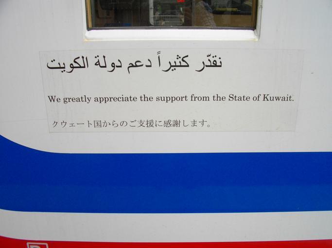 Keywords: Message of appreciation for Kuwaiti assistance (Sanriku Railway train).JPG Message of appreciation for Kuwaiti assistance Sanriku Railway train 三陸鉄道のクウェートからの支援感 文 own 11 August 2014 2014年8 11日 Abasaa あばさー Diesel multiple units of Sanriku Railway Multilingual signs in Japan |