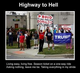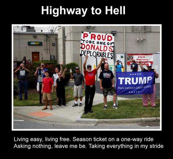 Keywords: ac/cd accd highway to hell highwaytohell song music hillary clinton hillaryclinton message deplorable trump the donald thedonald politics AC/DC - Highway to Hell Living easy, living free Season ticket on a one-way ride Asking nothing, leave me be Taking everything in my stride Don't need reason, don't need rhyme Ain't nothing I would rather do Going down, party time My friends are gonna be there too www.youtube.com/watch?v=l482T0yNkeo I'm on the highway to hell On the highway to hell Highway to hell I'm on the highway to hell No stop signs, speed limit Nobody's gonna slow me down Like a wheel, gonna spin it Nobody's gonna mess me around Hey Satan, paid my dues Playing in a rocking band Hey mama, look at me I'm on my way to the promised land, whoo! I'm on the highway to hell Highway to hell I'm on the highway to hell Highway to hell Don't stop me I'm on the highway to hell On the highway to hell I'm on the highway to hell On the highway Yeah, highway to hell I'm on the highway to hell Highway to hell Highway to hell And I'm going down All the way Whoa! I'm on the highway to hell AC/DC - Highway to Hell Living easy, living free Season ticket on a one-way ride Asking nothing, leave me be Taking everything in my stride Don't need reason, don't need rhyme Ain't nothing I would rather do Going down, party time My friends are gonna be there too www.youtube.com/watch?v=l482T0yNkeo I'm on the highway to hell On the highway to hell Highway to hell I'm on the highway to hell No stop signs, speed limit Nobody's gonna slow me down Like a wheel, gonna spin it Nobody's gonna mess me around Hey Satan, paid my dues Playing in a rocking band Hey mama, look at me I'm on my way to the promised land, whoo! I'm on the highway to hell Highway to hell I'm on the highway to hell Highway to hell Don't stop me I'm on the highway to hell On the highway to hell I'm on the highway to hell On the highway Yeah, highway to hell I'm on the highway to hell Highway to hell Highway to hell And I'm going down All the way Whoa! I'm on the highway to hell |