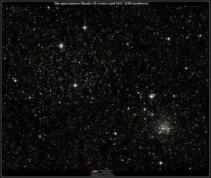 | Keywords: Messier 035 2MASS.jpg The open clusters Messier 35 center and NGC 2158 southwest http //www ipac caltech edu/2mass/gallery/messiercat html 2MASS Atlas Image Gallery The Messier Catalog Two Micron All Sky Survey 2MASS a joint project of the University of Massachusetts and the Infrared Processing and Analysis Center/California Institute of Technology funded by the National Aeronautics and Space Administration and the National Science Foundation 2MASS Atlas image Messier 35 2MASS Atlas Image Gallery The Messier Catalog BIG SIZE |